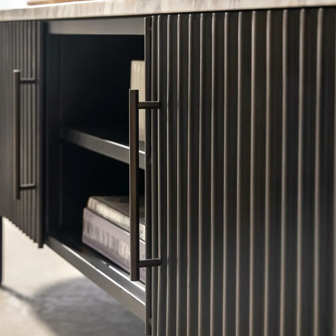 Le travail sur les portes nervurées renforce la présence visuelle du meuble, tout en accentuant ses nuances bronze. À la fois stable, qualitatif et facile à intégrer dans votre pièce, Alfred devient rapidement le point d’ancrage de votre salon.