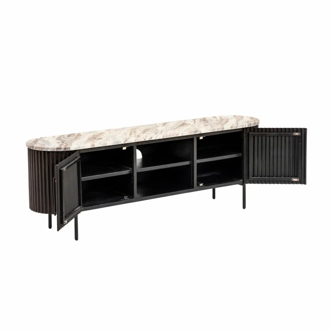 Découvrez le meuble TV Alfred, une pièce pensée pour apporter du caractère à votre espace de vie. Réalisé en métal avec de subtils reflets bronze, il présente un jeu de matières élégant qui lui confère une allure très actuelle. Son plateau en marbre apporte une touche minérale unique, avec des veinures naturelles qui font de chaque meuble une pièce singulière.