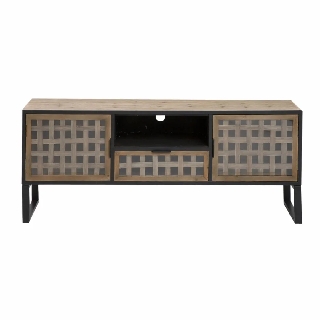 Conçu en sapin et métal noir, il s’appuie sur un design grillagé en bois pour se démarquer et proposer un meuble original. Pensé afin de faciliter votre organisation et votre rangement au quotidien, il vous propose 2 portes et 1 tiroir où vous pourrez stocker vos DVD, bouquins et télécommandes. Vous profiterez également d’une niche dotée d’un passe câbles pour disposer vos lecteurs et consoles. Vous trouverez 3 vitres au niveau des portes et tiroir.