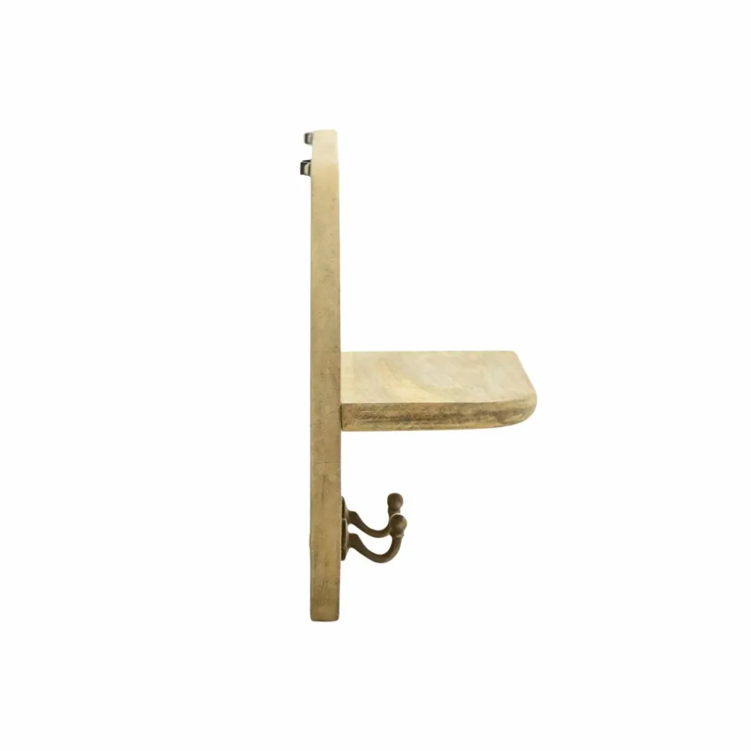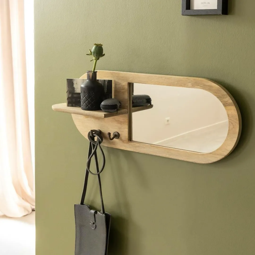 Avec sa forme ovale asymétrique et sa teinte de manguier clair, ce miroir mural de la collection Juliet apporte une note lumineuse et chaleureuse à votre intérieur. Il se distingue par son style original, pensé pour conjuguer esthétisme et praticité. La tablette intégrée vous permet de déposer clés, petite déco ou accessoires, tandis que les deux patères en métal vieilli ajoutent un côté vintage subtil, parfait pour suspendre sacs ou foulards.