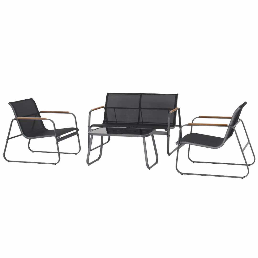 Les accoudoirs effet bois apportent une note chaleureuse à l’ensemble. Il comprend un canapé deux places, deux fauteuils une place et une table basse avec plateau en verre, parfait pour créer un espace extérieur chic et cosy.