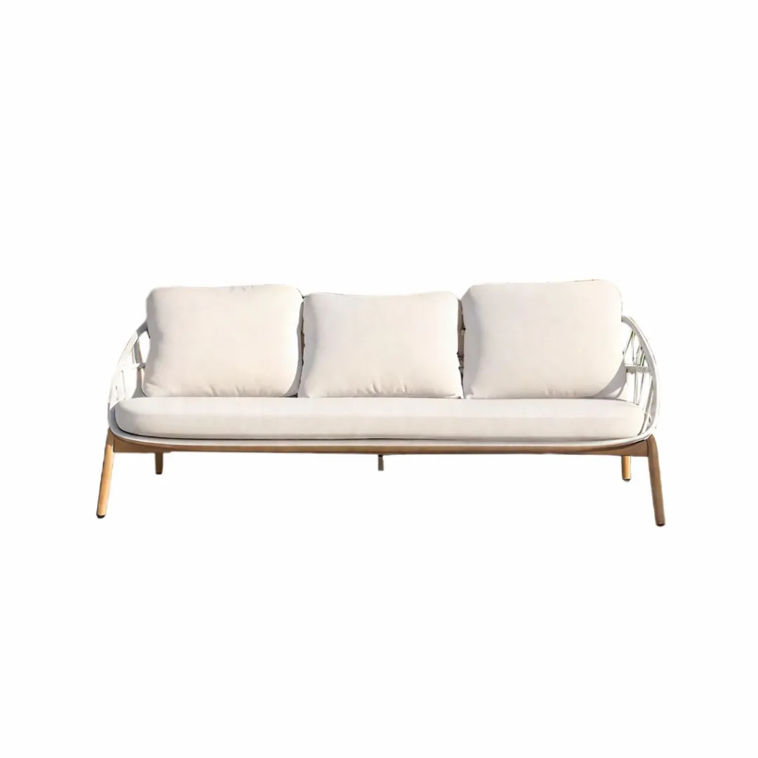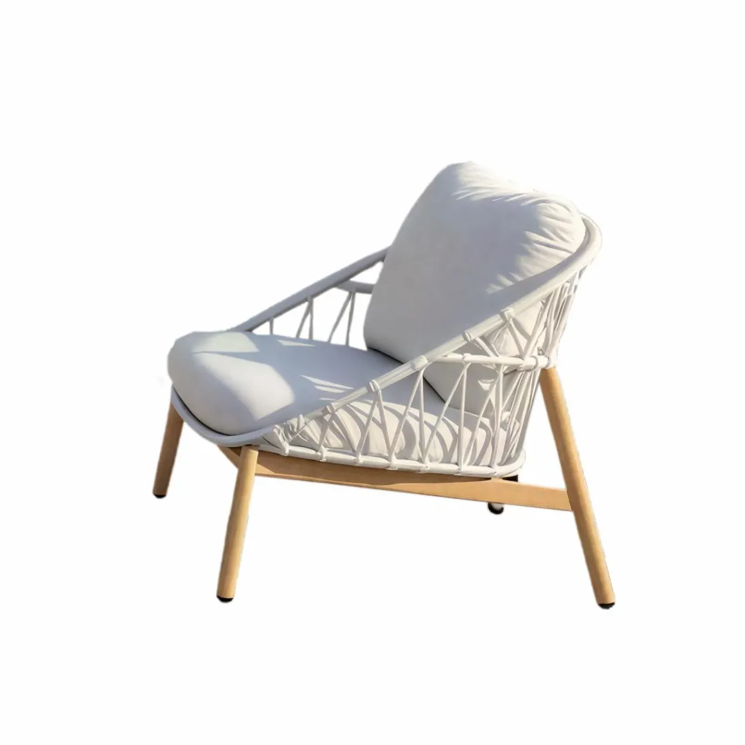 Leur dossier en corde blanche apporte une touche bohème, tandis que la structure en aluminium effet bois assure solidité et légèreté.Les coussins moelleux offrent un confort optimal pour des moments de détente en plein air. Parfait pour sublimer votre terrasse ou jardin avec style et modernité.