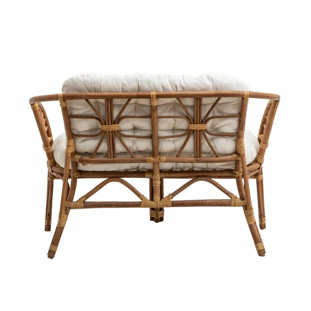 Son design aux lignes arrondies et légères met en valeur le charme authentique du rotin tressé, tandis que les coussins moelleux et épais, revêtus d’un tissu doux et résistant, offrent un confort optimal pour vos moments de détente.