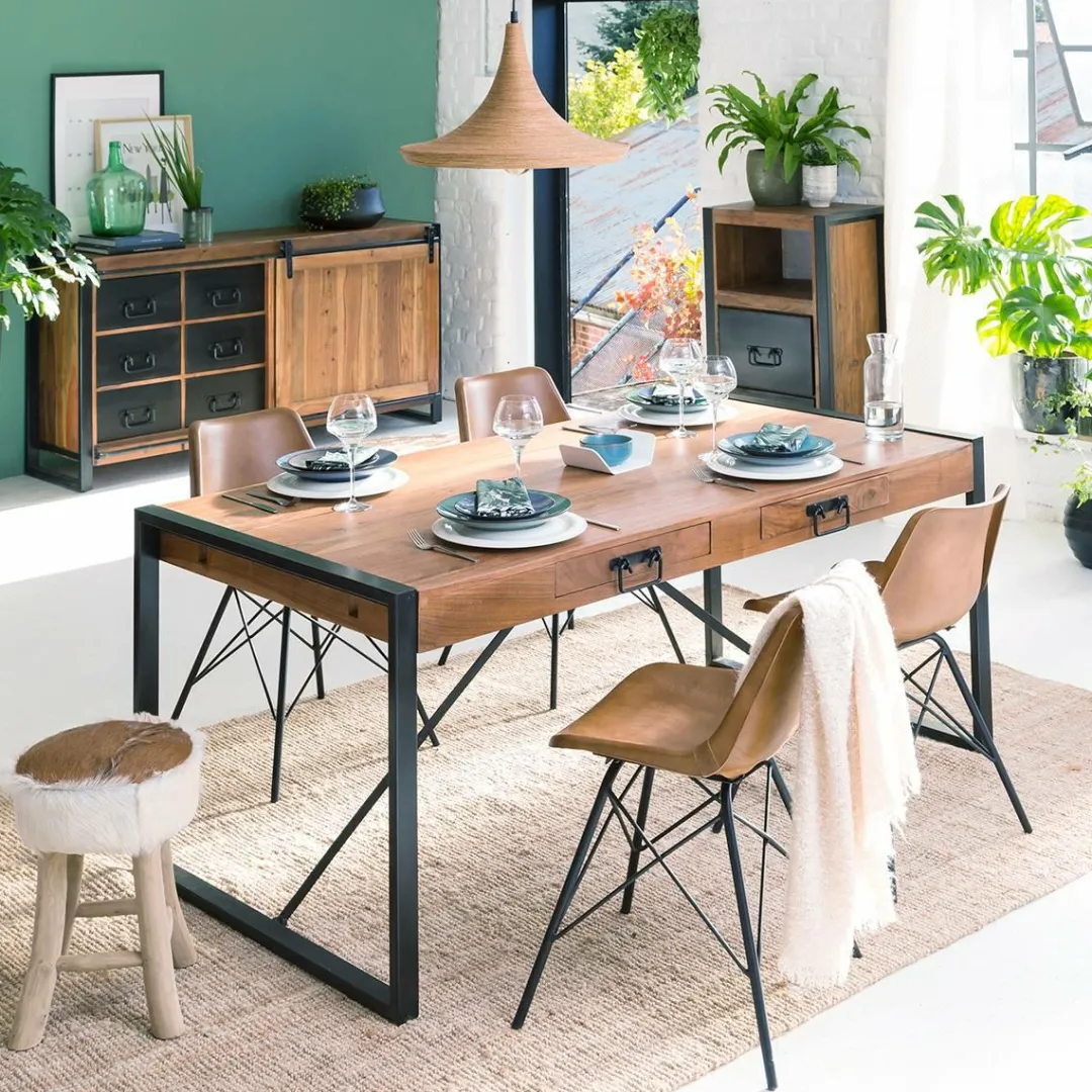 Cette table industrielle fait partie de la collection HAVANA : Vous pourrez aisément la combiner chaises assorties et le buffet, et profiter de tarifs avantageux sur la livraison. Pour information, cette table existe également en manguier et bois coloré.