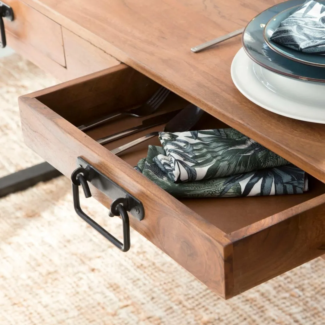 Cette table à manger industrielle saura vous apporter praticité et fonctionnalité grâce à ses dimensions optimales qui vous permettront de rassembler au moins six convives. Son petit plus, elle dispose de deux allonges supplémentaires (40 cm chacune) qui vous permettront de passer facilement de 180 à 260 cm. Pour installer les allonges, il vous faudra emboiter les 2 baguettes dans les trous déjà définis, une seule personne suffit pour les installer. Elles sont donc à stocker lorsqu’elles ne sont pas utilisées. Ce meuble se démarque grâce à ses deux tiroirs qui apporte une touche d’originalité, chacun d’eux dispose d’une profondeur de 35 cm, vous pourrez aisément stocker vos couverts ou encore de la paperasse, cela est très utile au quotidien.