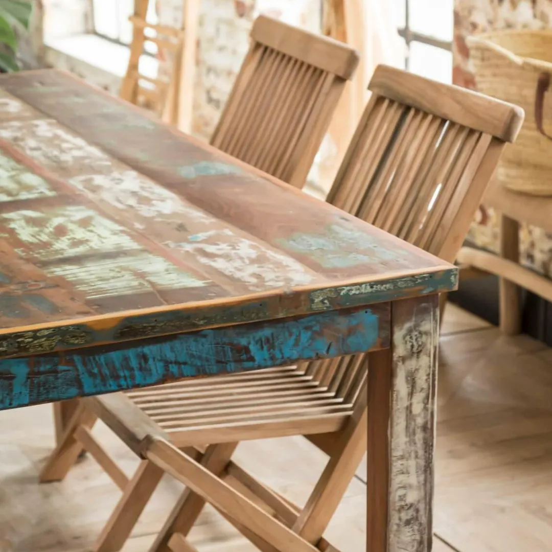 Cette table à manger possède une structure en bois recyclé coloré. Ses dimensions standard vous permettront de recevoir 6 personnes et ainsi de partager de bons moments autour d’un repas en famille ou entre amis. Le bois coloré, lui, apportera chaleur et convivialité à votre pièce.