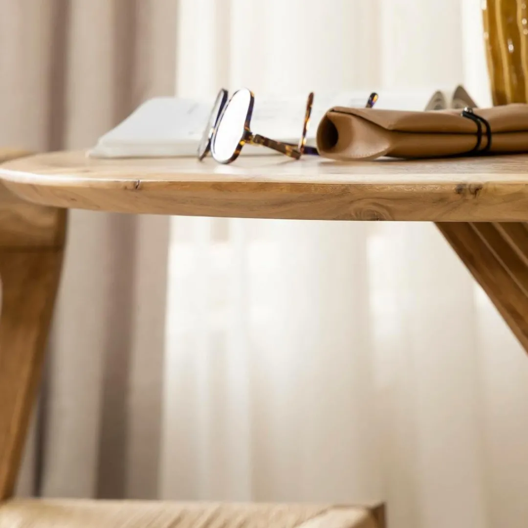 Le bois d’acacia, avec ses veines apparentes et ses nuances dorées, ajoute du charme et de l’authenticité. Une table qui s’intègre aussi bien dans un intérieur contemporain que plus bohème.