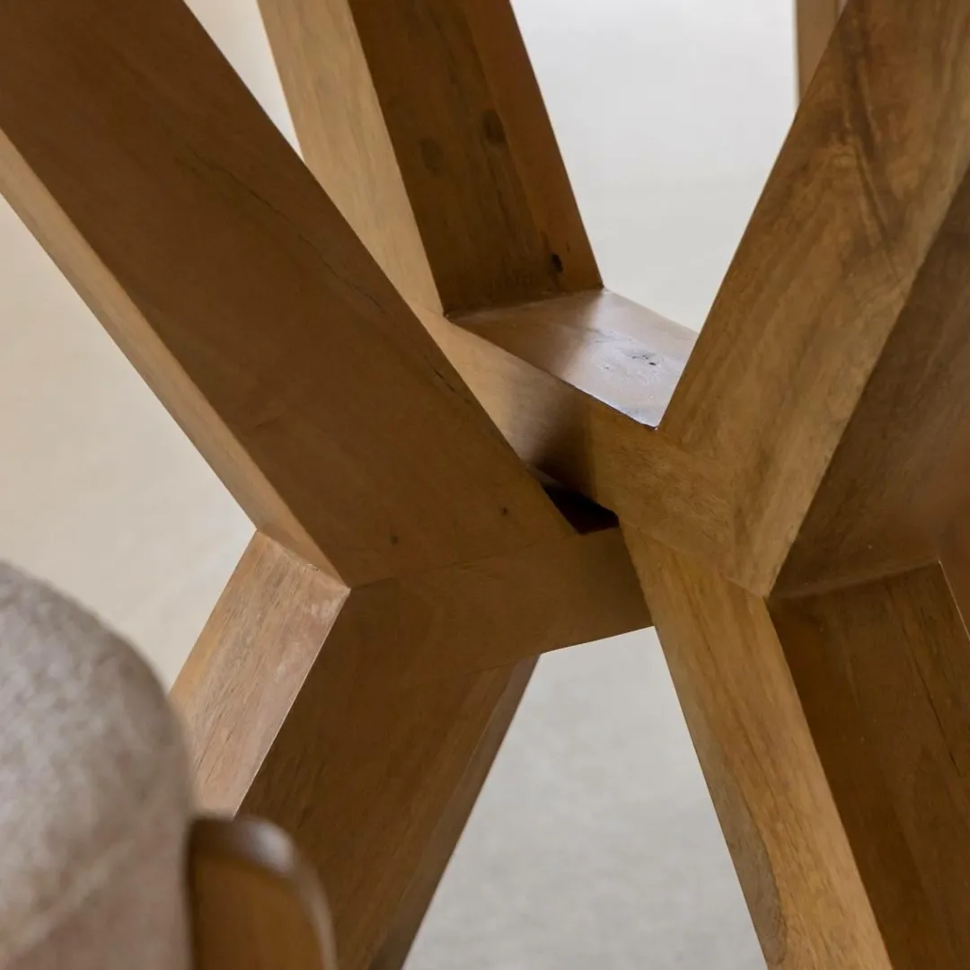 Créez un espace de convivialité avec cette table ronde en bois de manguier de notre collection Maloé, au design sculptural et chaleureux. Son plateau circulaire repose sur un piètement central croisé, à la fois original et stable, qui évoque les inspirations géométriques du mobilier contemporain. Le bois de manguier dévoile un veinage doux et irrégulier, typique des essences exotiques, pour une ambiance naturelle et authentique.