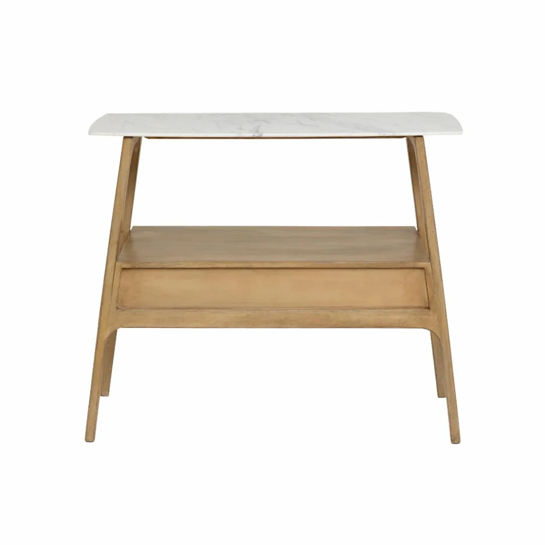 La console Hari marie avec élégance le raffinement du plateau en marbre blanc et la chaleur du bois de manguier. Dotée de deux tiroirs ornés de poignées métalliques dorées, elle allie fonctionnalité et esthétique dans un style contemporain.