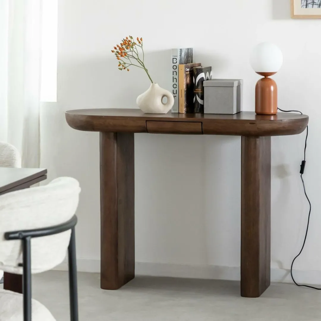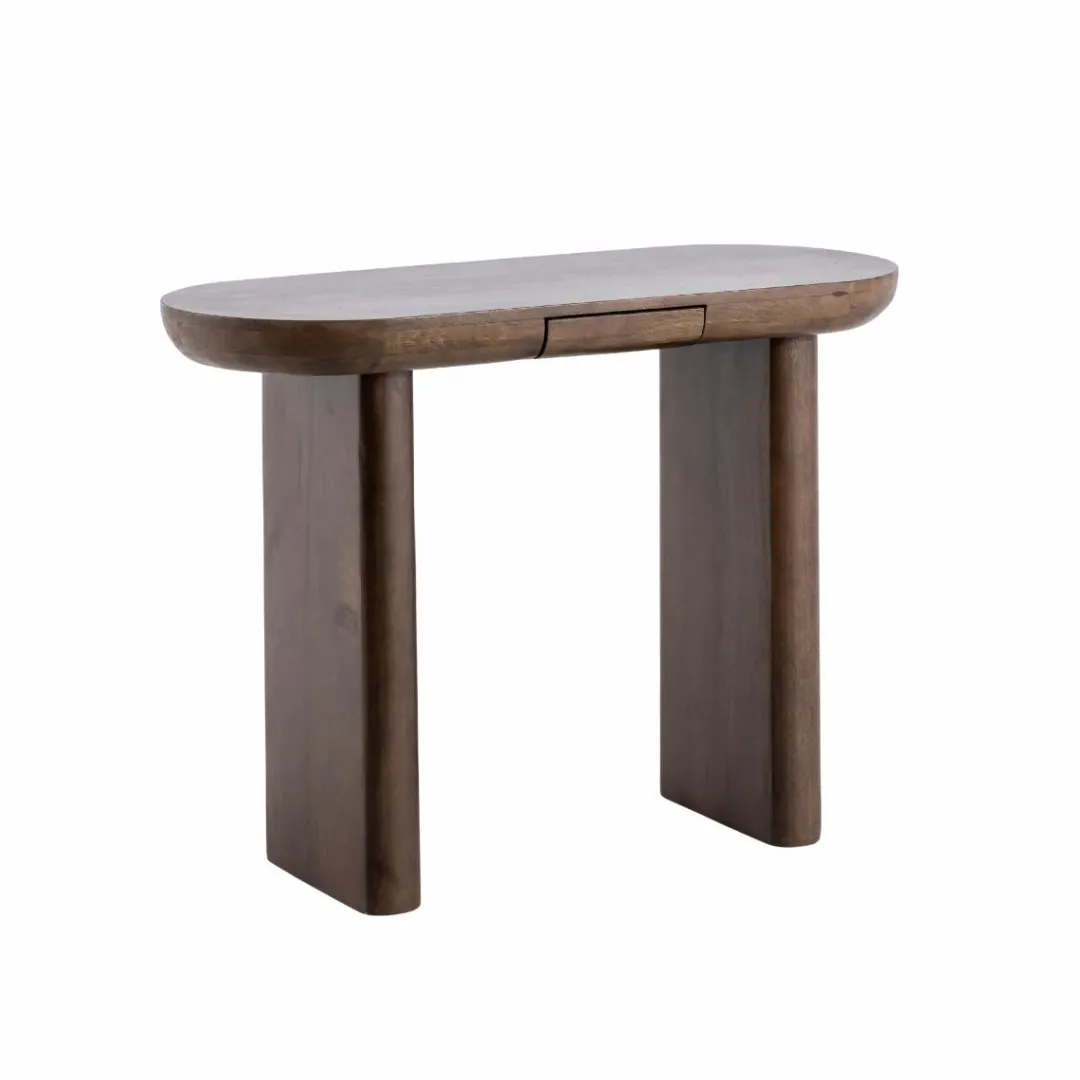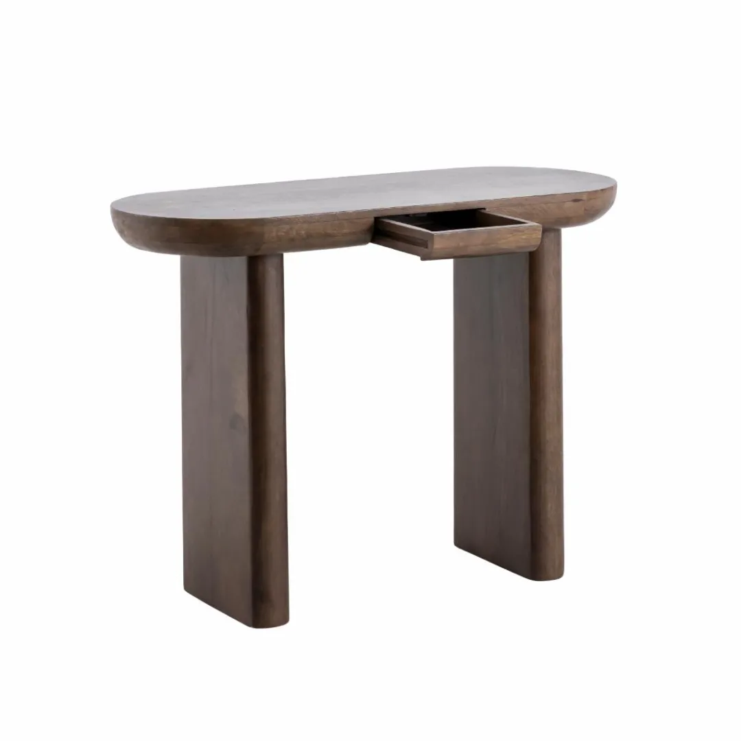 Cette console en bois de manguier foncé séduit par son design simple et raffiné. Son plateau aux lignes arrondies repose sur deux pieds massifs, lui offrant une allure robuste tout en conservant une élégance naturelle. La teinte foncée du bois met en valeur ses nuances chaleureuses et apporte une note sophistiquée à votre intérieur.