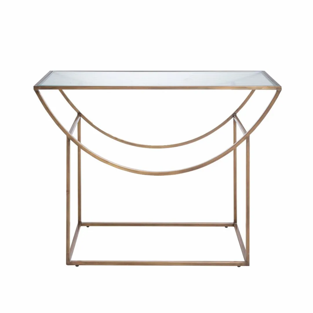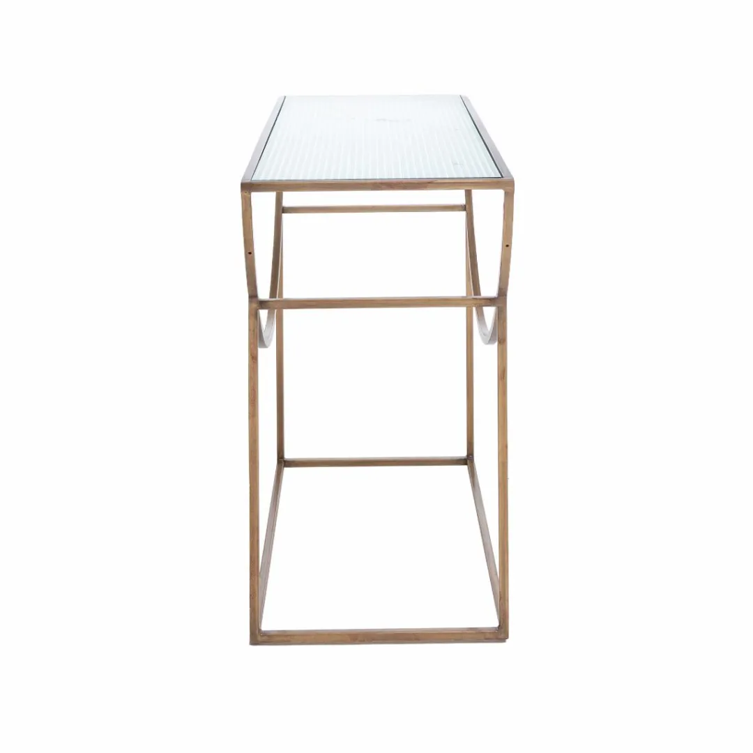 Pour un style original et chic, optez pour cette console. Grâce à son métal doré et sa plaque en verre, elle apportera à votre intérieur une touche originale. Avec sa hauteur de 76 cm et sa largeur de 105.5 cm, elle est idéale pour occuper l’espace de votre pièce sans y être encombrante. Vous pouvez y poser des éléments décoratifs comme des fleurs, des bougies… mais vous pouvez vous en servire comme une pièce pratique, en y posant des livres, des clés etc.