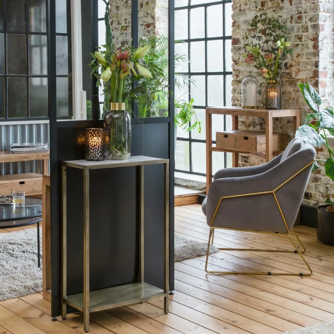 Conçue à partir de métal couleur laiton pour sa structure mais aussi de marbre pour son plateau cette console industrielle dispose de dimensions idéales qui vous permettront de la placer dans un espace innocupé. Très pratique, son double plateau vous offrira un espace de rangement supplémentaire.