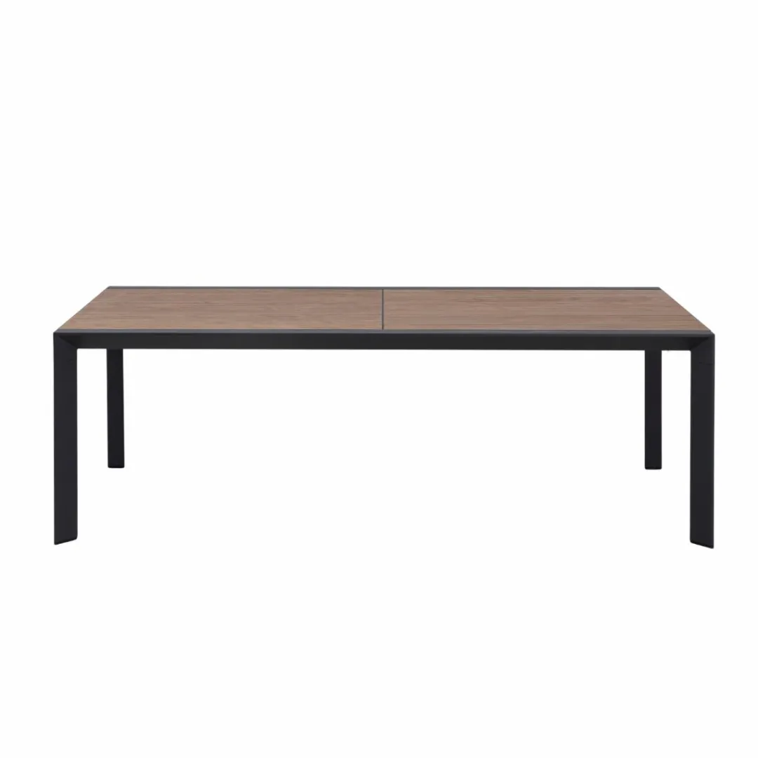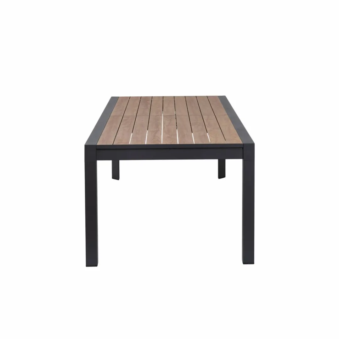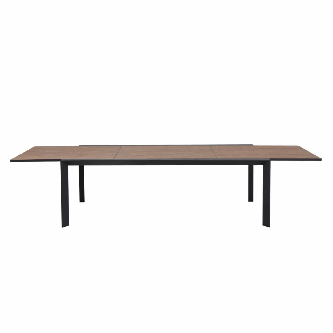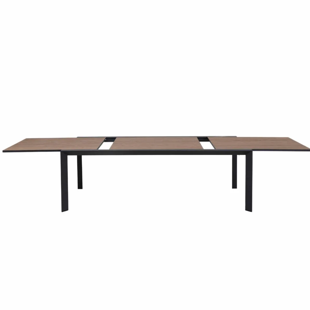 D’une longueur initiale de 231 cm, elle se transforme en un clin d’œil pour atteindre 346 cm, créant un espace idéal pour 12 à 14 convives. Son plateau effet bois, chaleureux et élégant, contraste parfaitement avec sa structure en aluminium gris pour un look à la fois moderne et naturel.