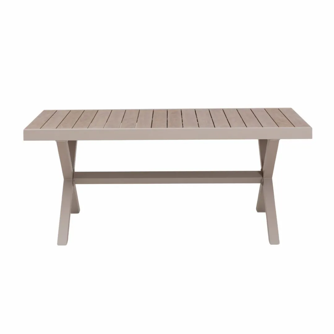 La table de jardin Ayden redéfinit l’art de recevoir en extérieur. Son design raffiné, alliant une structure en aluminium gris et un plateau à lattes effet bois, lui permet de s’intégrer aussi bien dans un décor moderne que plus naturel.