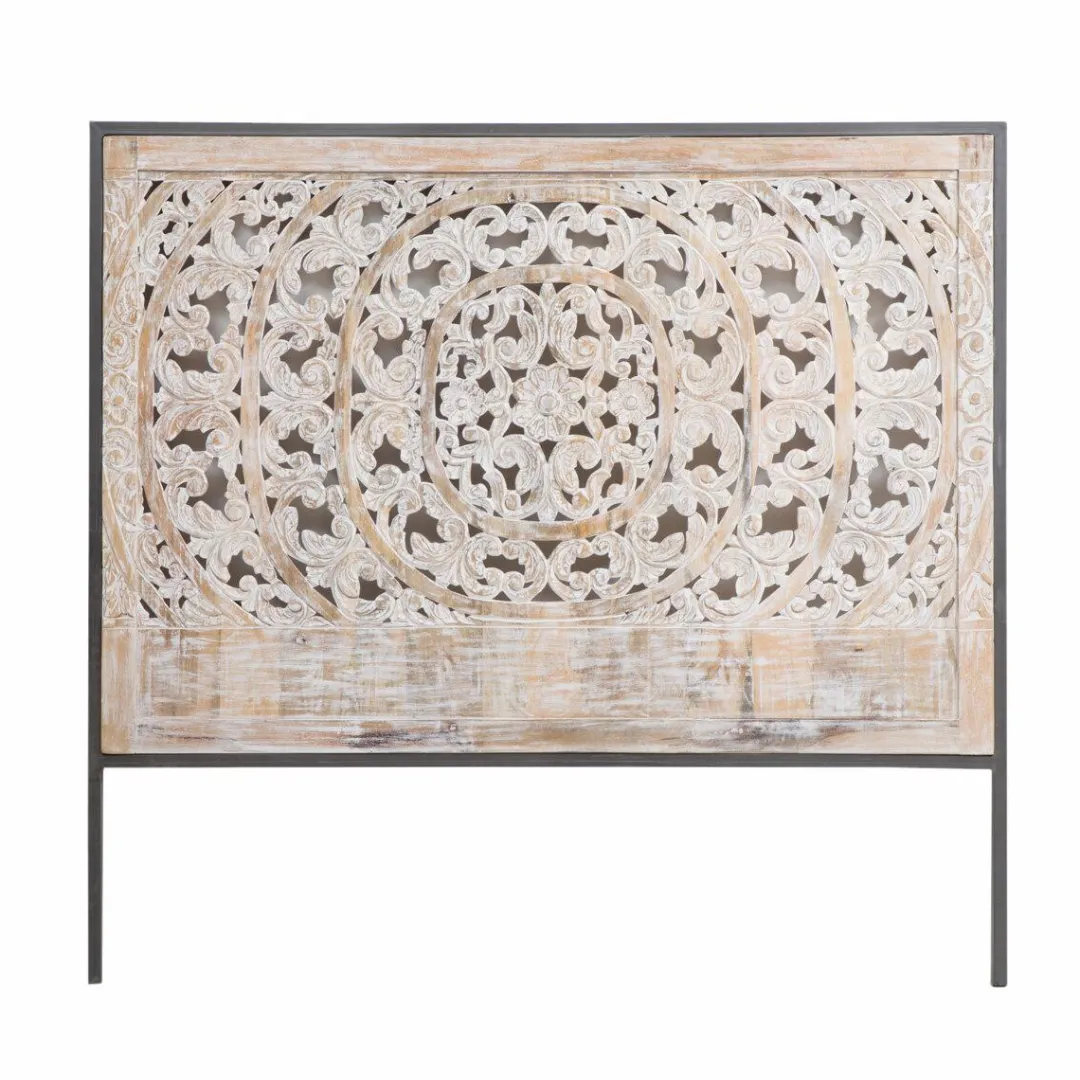 Découvrez cette superbe tête de lit qui plaira aux amateurs de meuble bohème. Conçue en bois de manguier blanchi et en métal noir, cette tête de lit en bois massif 160 cm soulignera vos goûts pour les tendances actuelles. Son design sculpté apportera un charme supplémentaire dans votre chambre.
