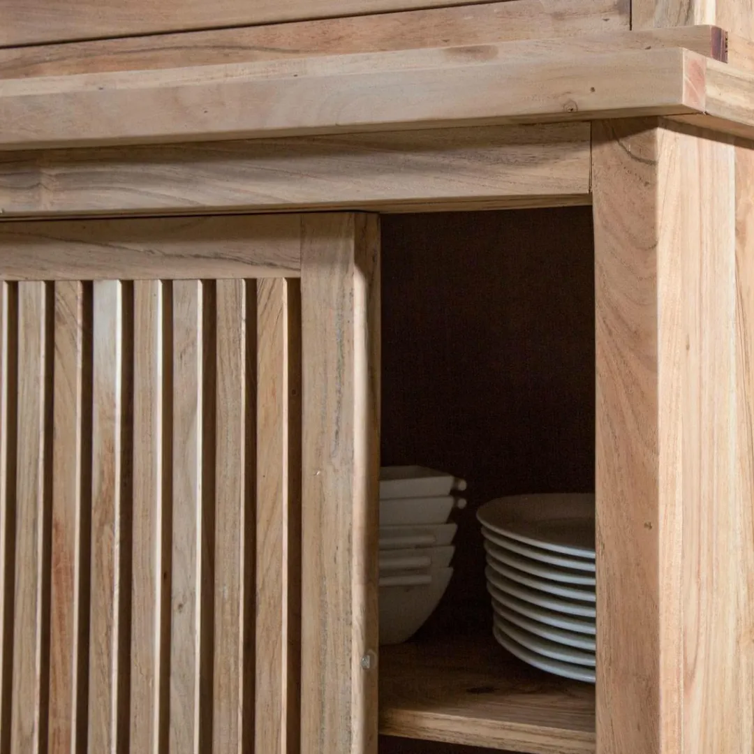 Ce buffet vasselier est une conception 100% acacia ! On aime beaucoup les nuances lumineuses qui se dégagent du bois ainsi que sa robustesse. Ce bois s’entretient très facilement. Optez pour ce vaisselier qui vous accompagnera durant de nombreuses années !