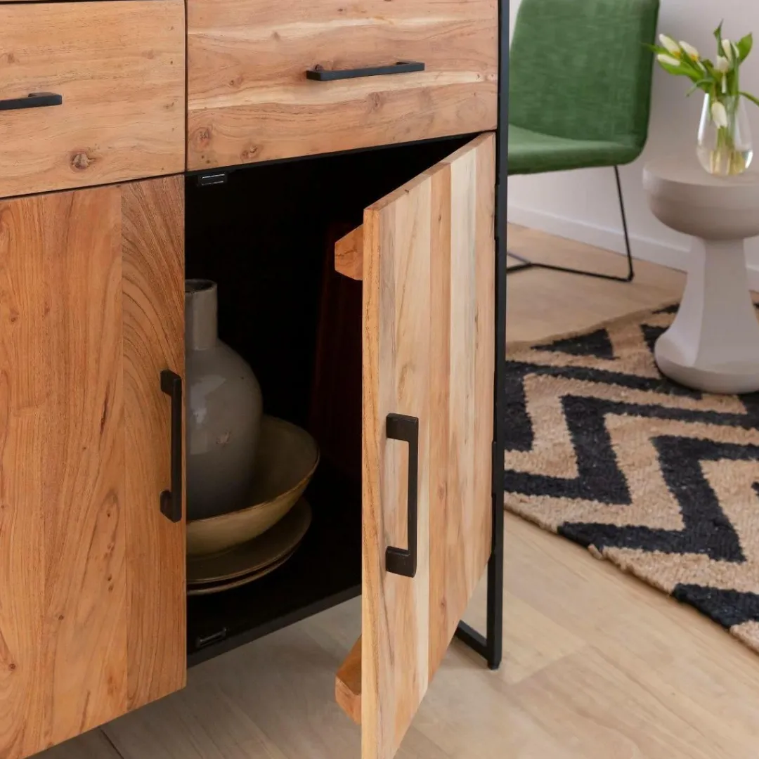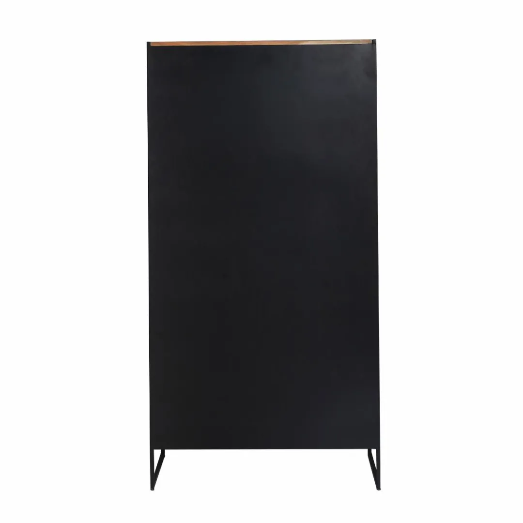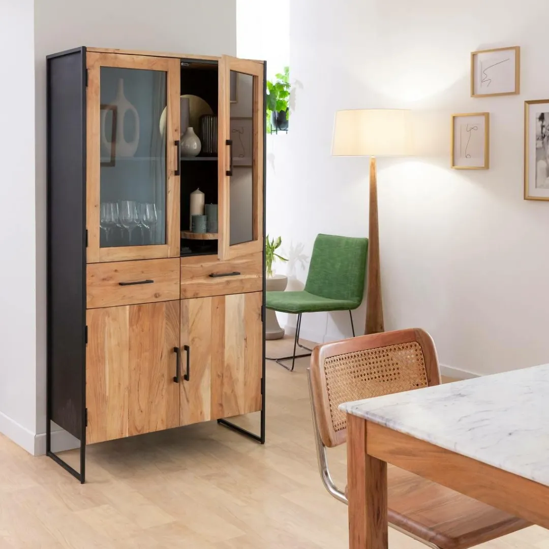 Cette vitrine est conçue en bois d’acacia et métal noir.