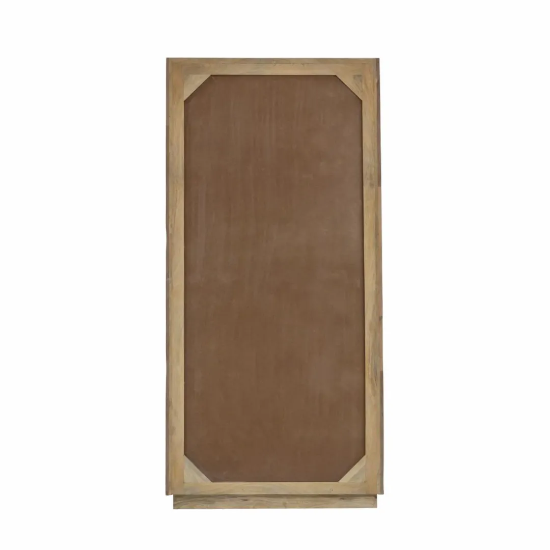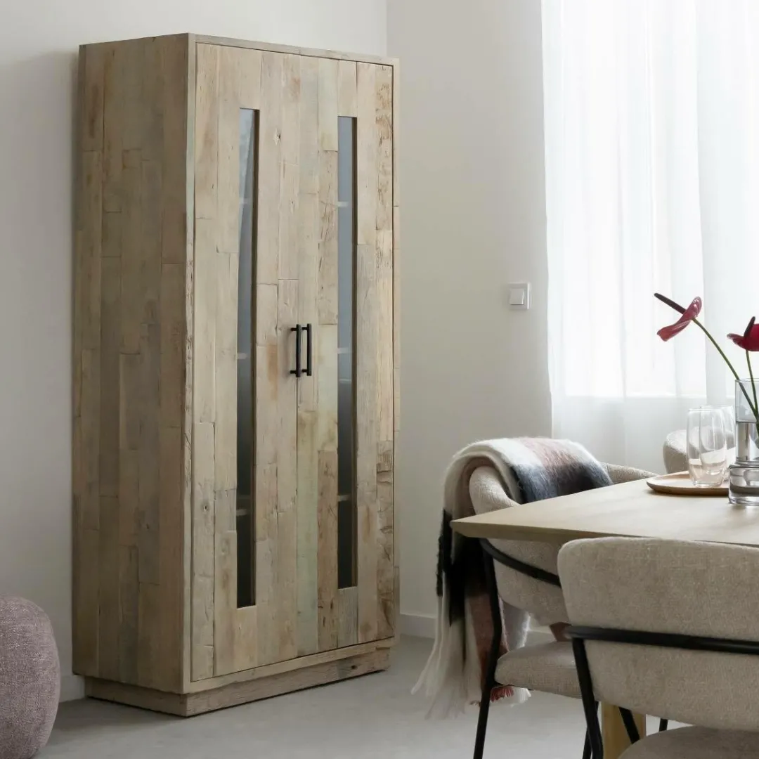 Cette vitrine associe charme authentique et élégance contemporaine grâce à son mélange de bois de manguier et de bois recyclé. Son design met en valeur les nuances du bois, soulignées par des lignes épurées et rehaussées de deux portes vitrées qui laissent entrevoir vos objets. Les poignées métalliques noires viennent apporter une touche de contraste subtile, renforçant son allure moderne tout en respectant l’esprit brut du bois.