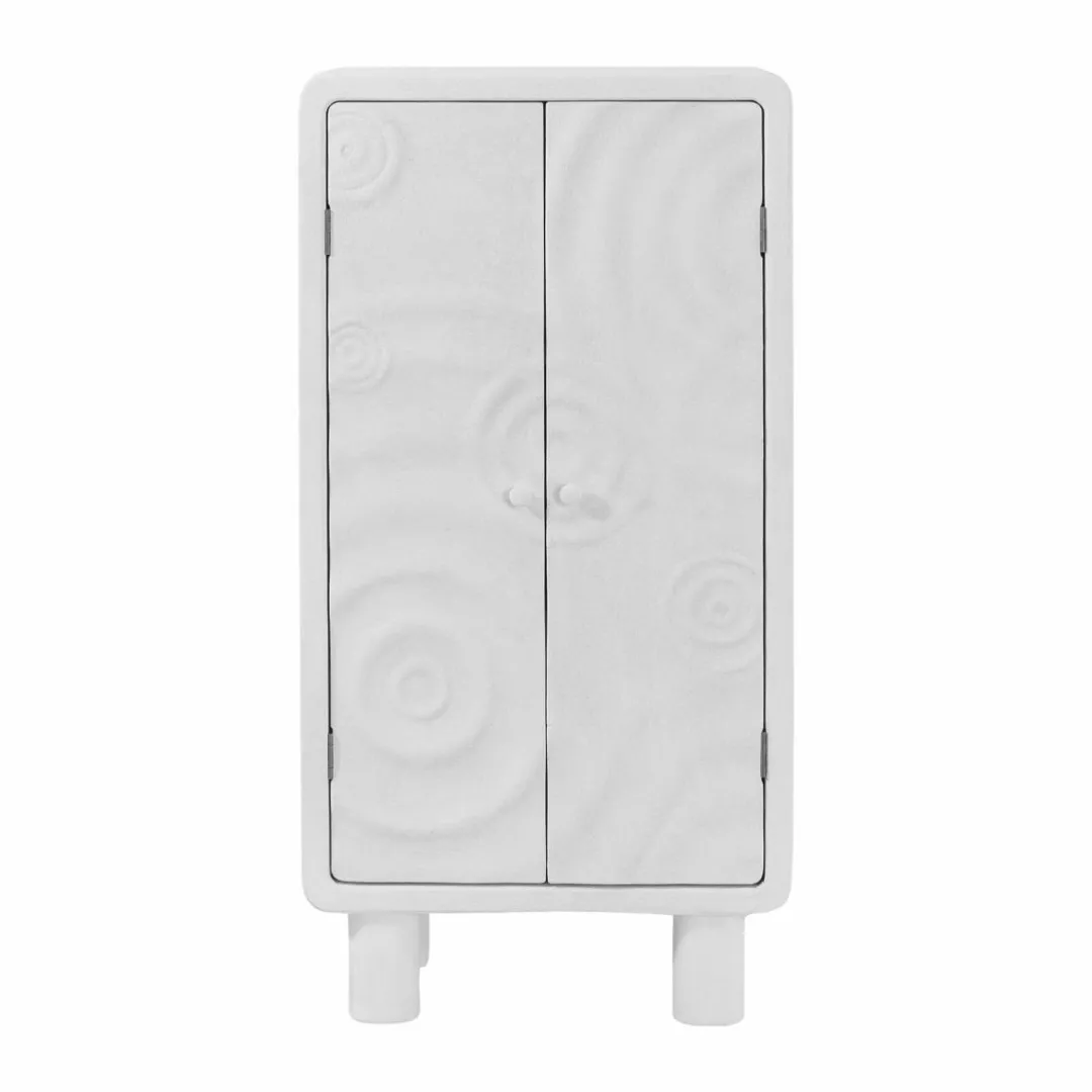 Ce buffet de la collection Danaé bouscule les codes du rangement traditionnel avec son esthétique sculpturale et texturée. Entièrement habillé de polyrésine blanche, il séduit par ses formes arrondies et ses motifs en cercles concentriques qui semblent onduler à la surface des portes comme des empreintes dans l’argile.