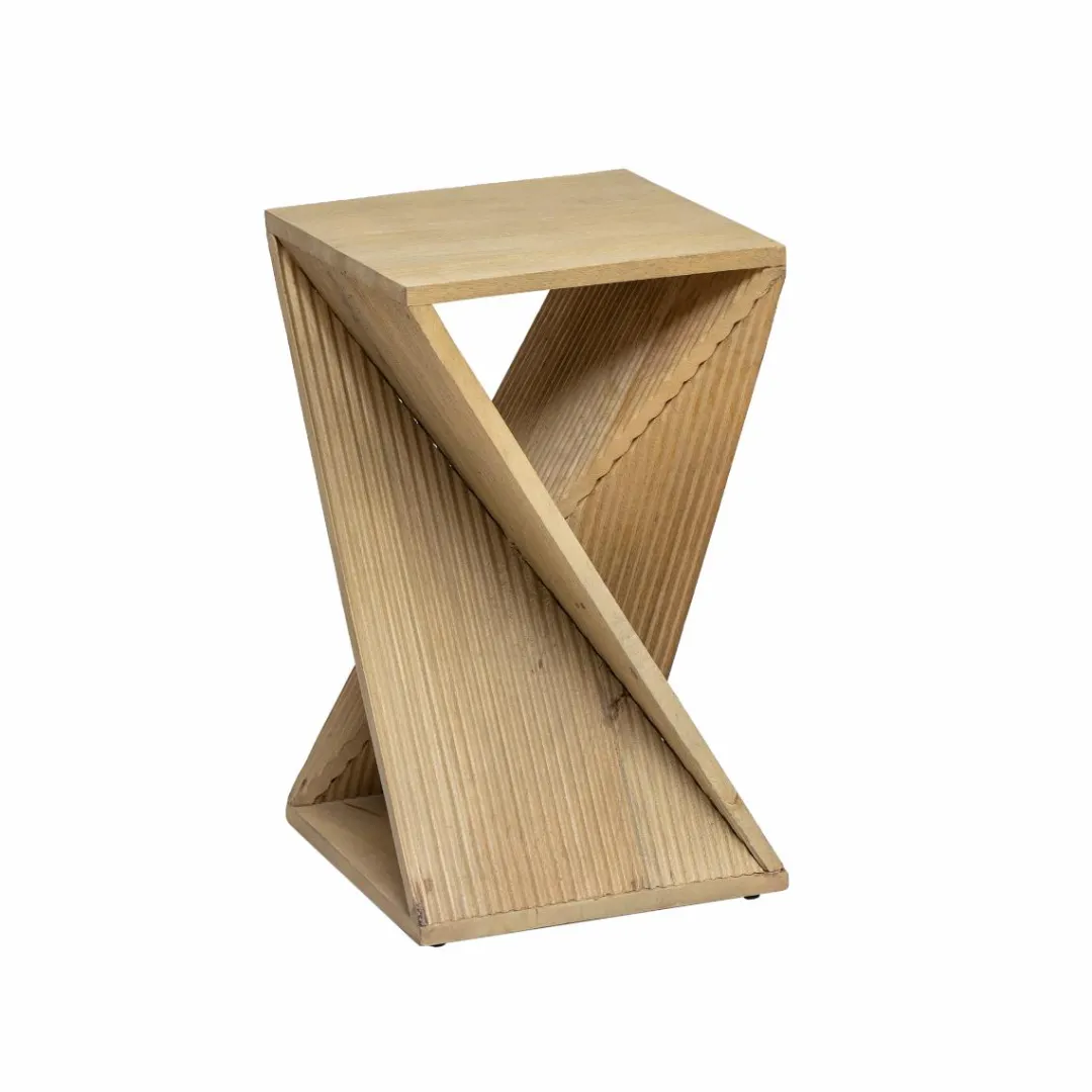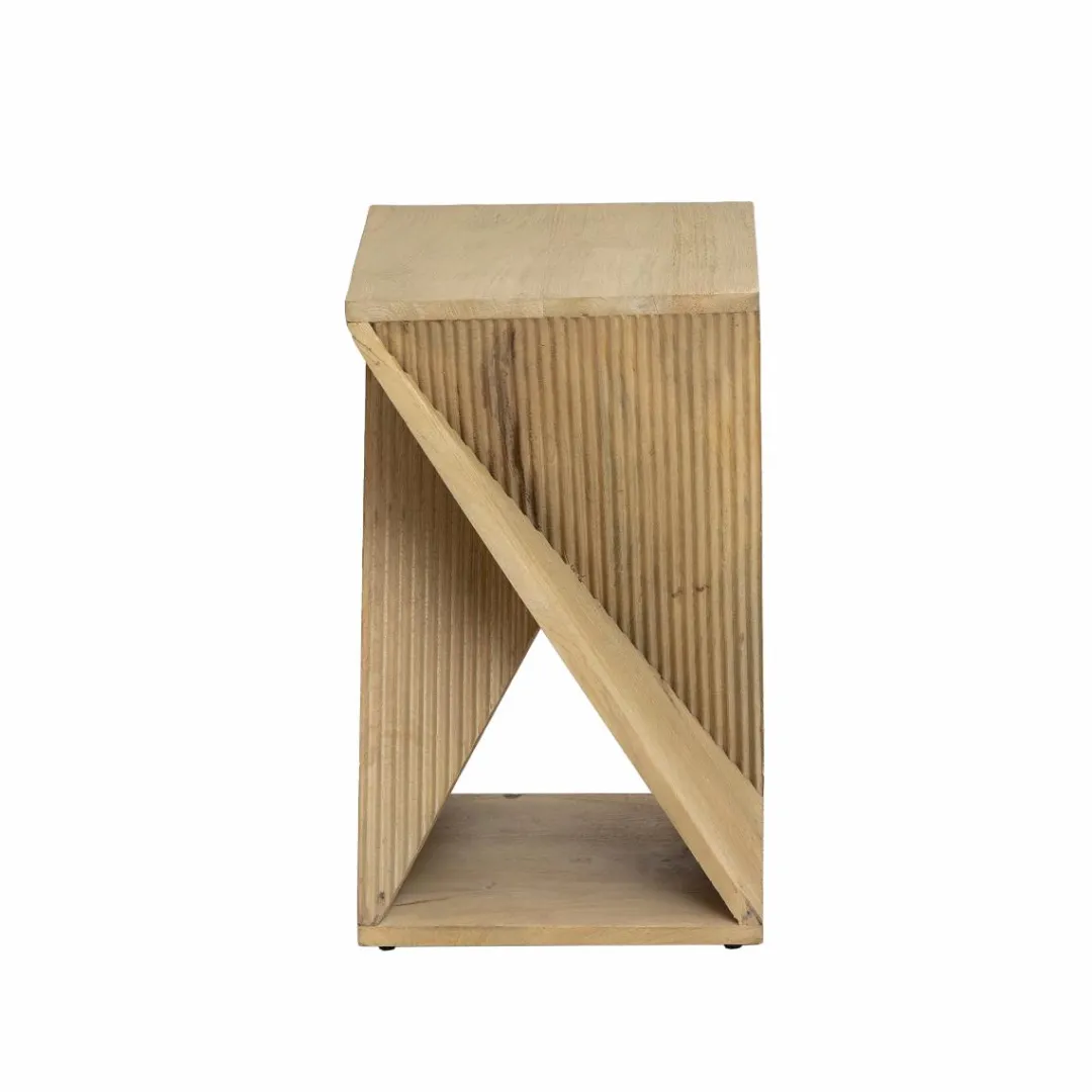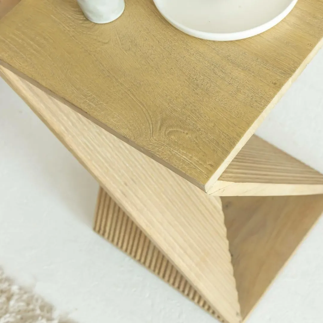 Le bout de canapé Amara en bois de manguier présente une élégante forme sablier.