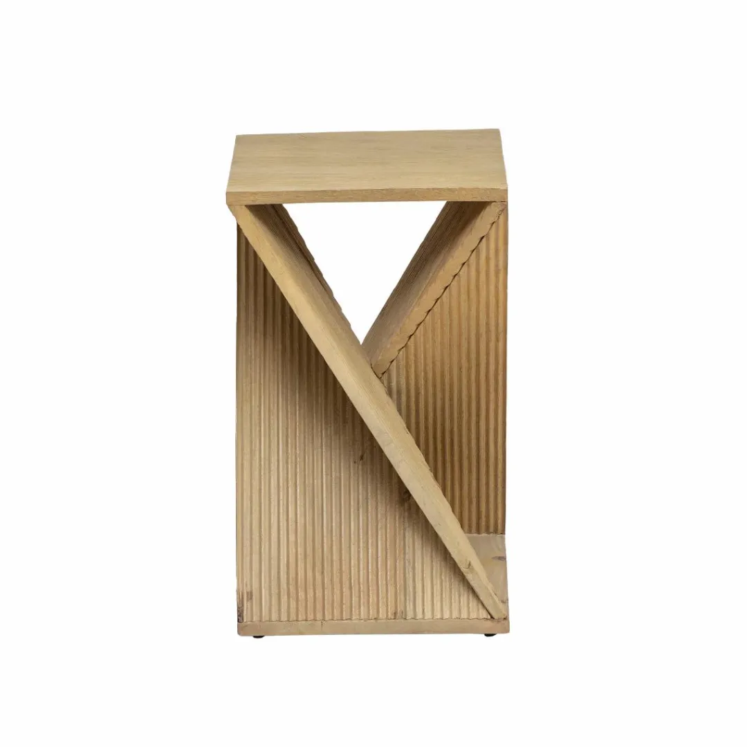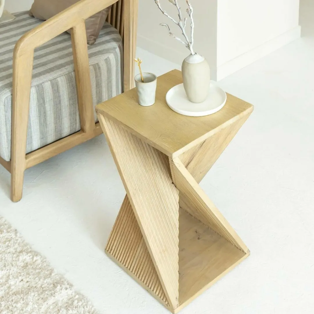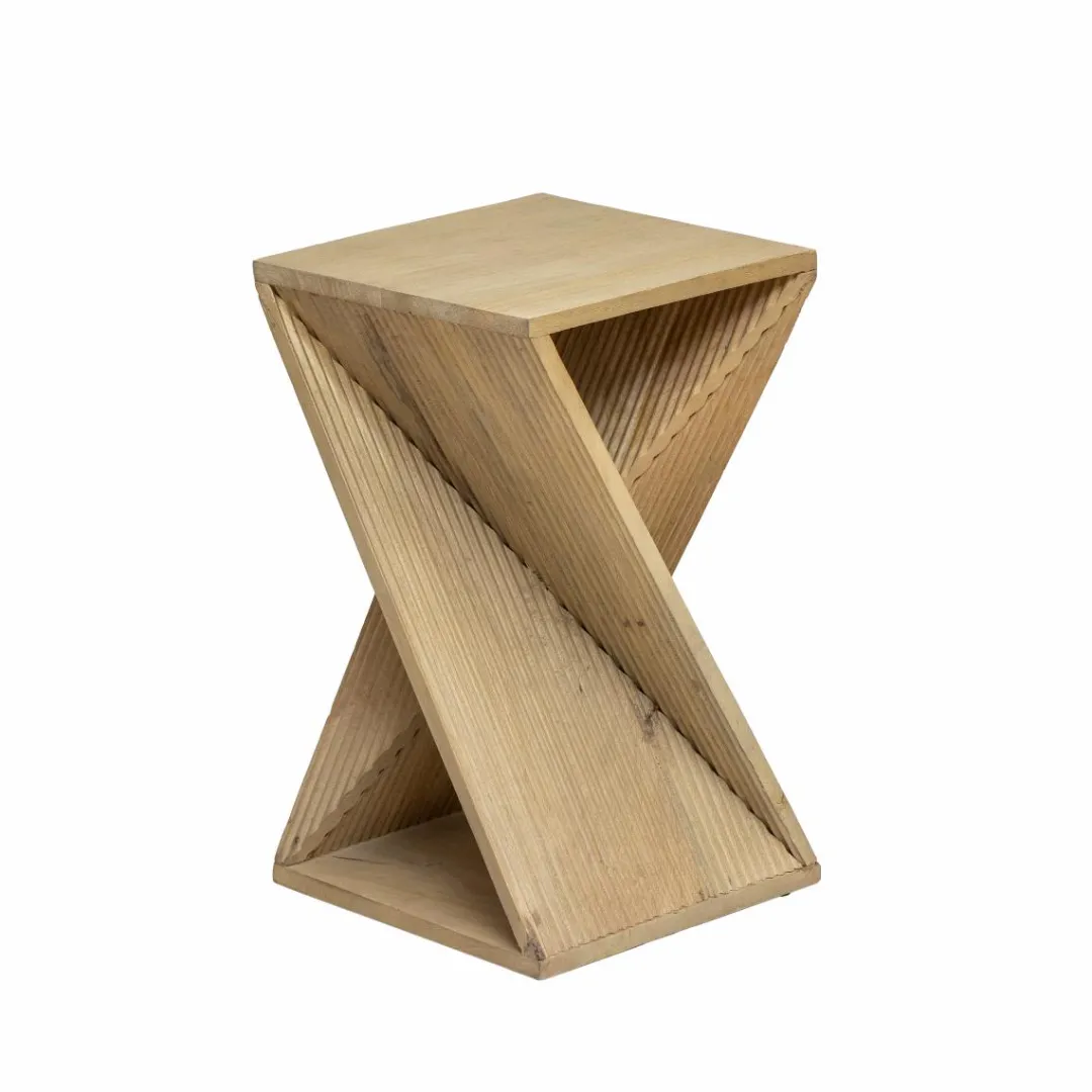 Le bout de canapé Amara en bois de manguier présente une élégante forme sablier.