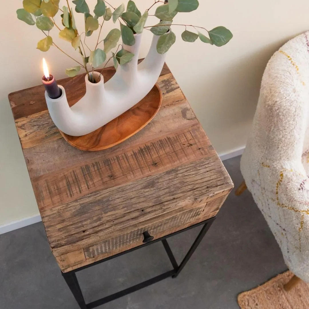 Vicky mesure 90 cm de haut, 40 cm de large et 40 cm de profondeur. A l’intérieur, vous trouverez un petit tiroir – parfait pour tous les objets qui nécessitent un accès rapide ! Qu’elle soit placée dans le salon, la chambre à coucher ou même le couloir, cette Sellette Vicky ne manquera pas d’injecter une touche de charme industriel dans votre maison.