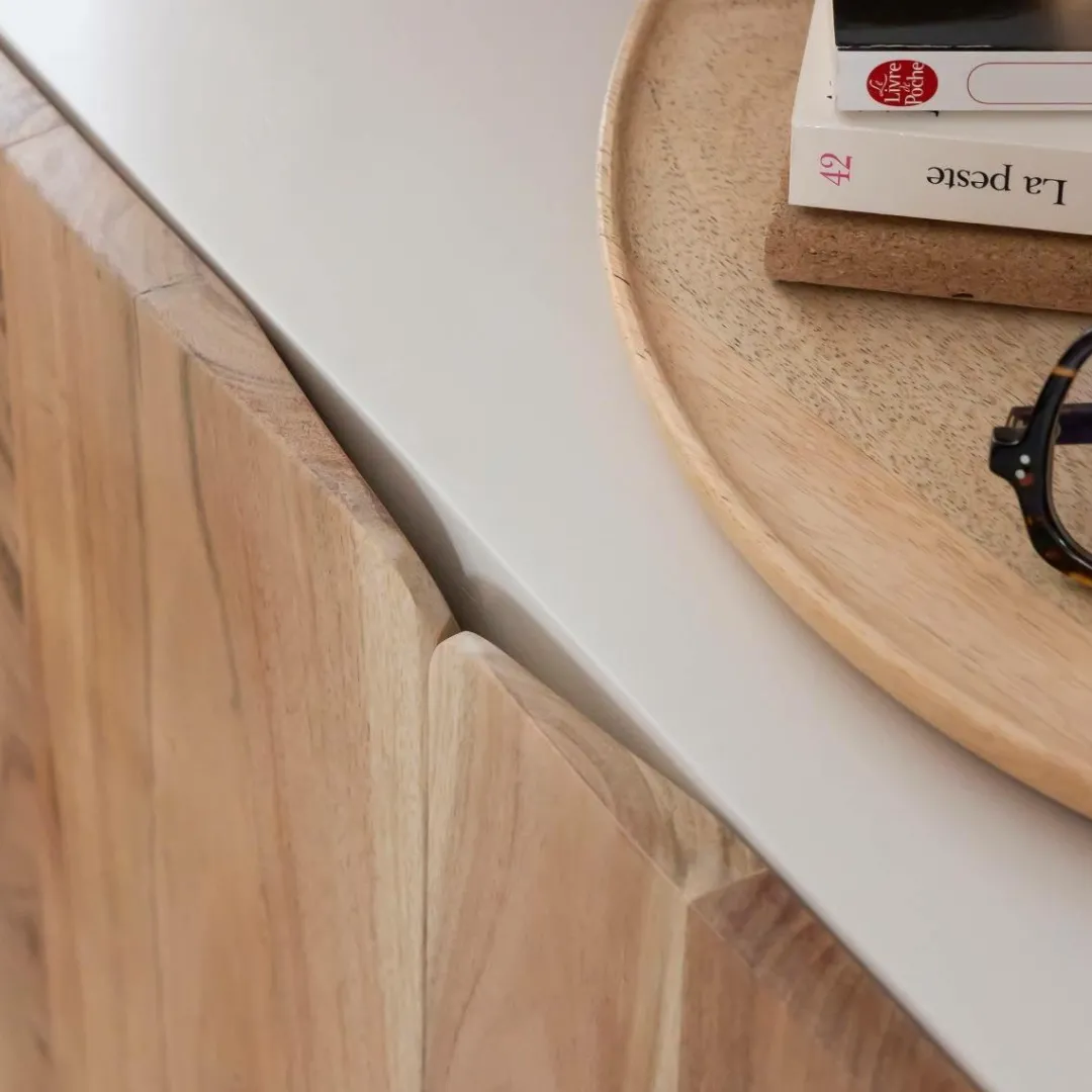 Ce buffet séduit par l’association harmonieuse de deux essences de bois : une structure en manguier blanchi qui apporte luminosité et douceur, et des portes en acacia naturel qui révèlent des nuances chaleureuses et authentiques. Son design épuré et contemporain en fait une pièce de caractère, capable de sublimer aussi bien un intérieur moderne qu’un décor plus naturel.