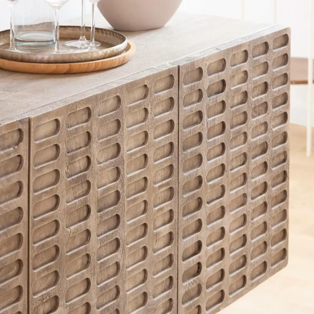 Idéal pour organiser votre salle à manger, le Buffet Clara offre un grand espace de rangement avec trois compartiments dotés de portes sculptées uniques. Gardez tout ce dont vous avez besoin caché derrière ces magnifiques portes tout en utilisant le haut du buffet pour exposer des vases, des photographies ou d’autres bibelots.