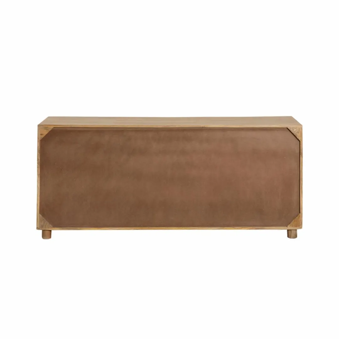 La structure est entièrement réalisée en bois de manguier, apprécié pour son grain marqué, sa teinte chaude et sa robustesse. Les façades texturées à lames verticales sont sublimées par des panneaux arrondis en applique, qui adoucissent l’ensemble et lui donnent une identité forte. Derrière ses 4 portes, ce buffet offre un grand volume de rangement, parfait pour la vaisselle, le linge de maison ou les objets du quotidien.