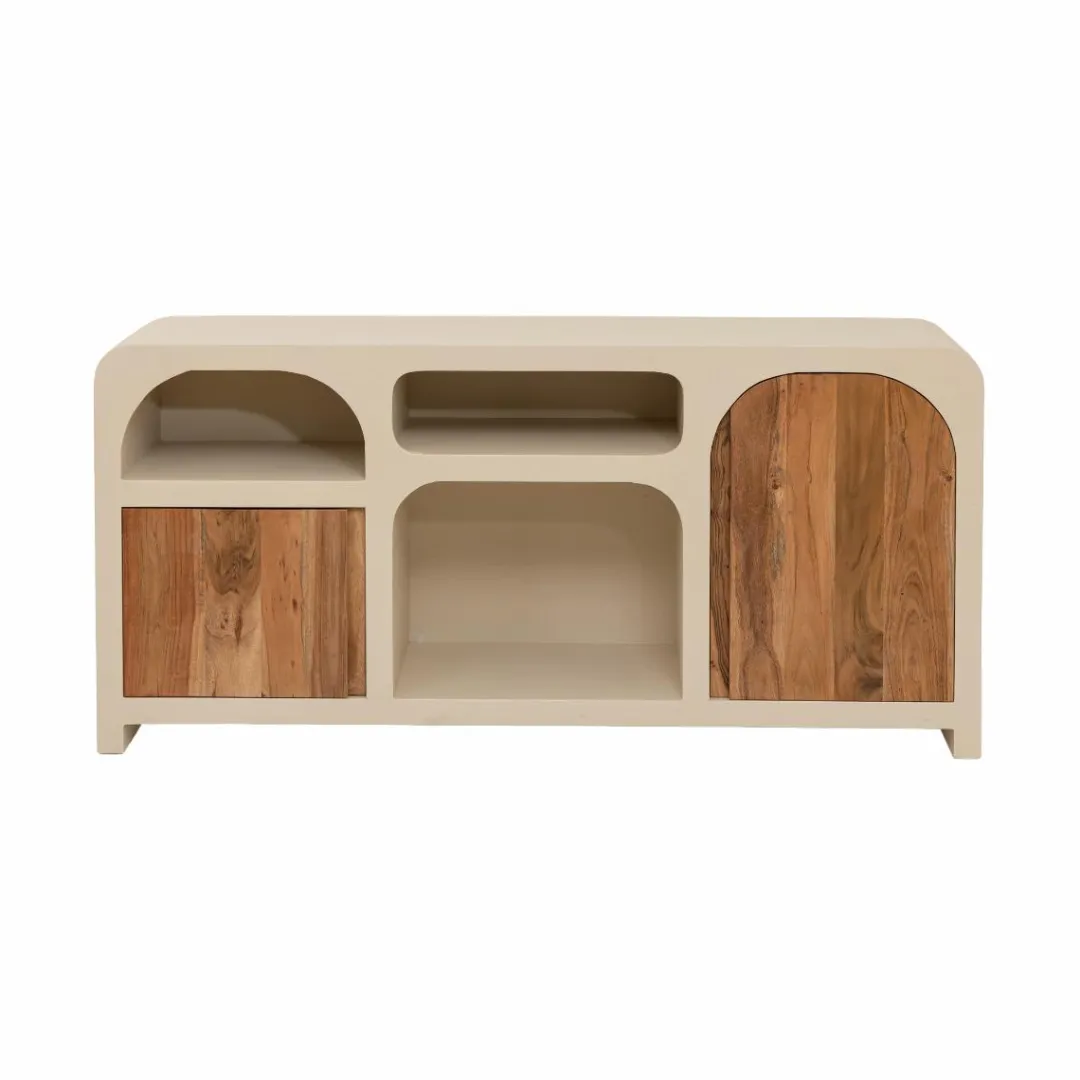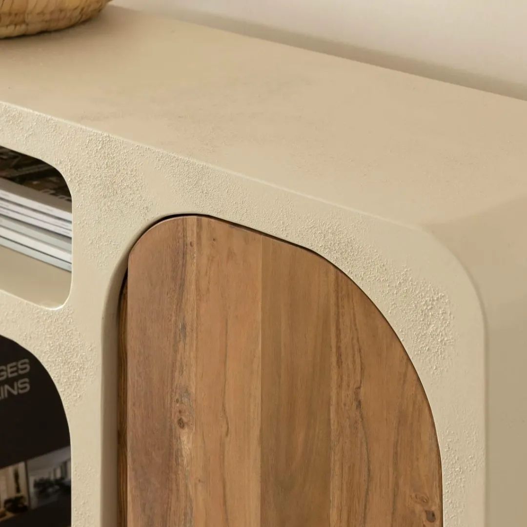 Le Buffet Dalva offre une fusion harmonieuse de styles contemporains et méditerranéens. Sa structure en MDF présente un effet béton qui ajoute une touche moderne, tandis que les portes en bois d’acacia apportent une chaleur organique à l’ensemble.