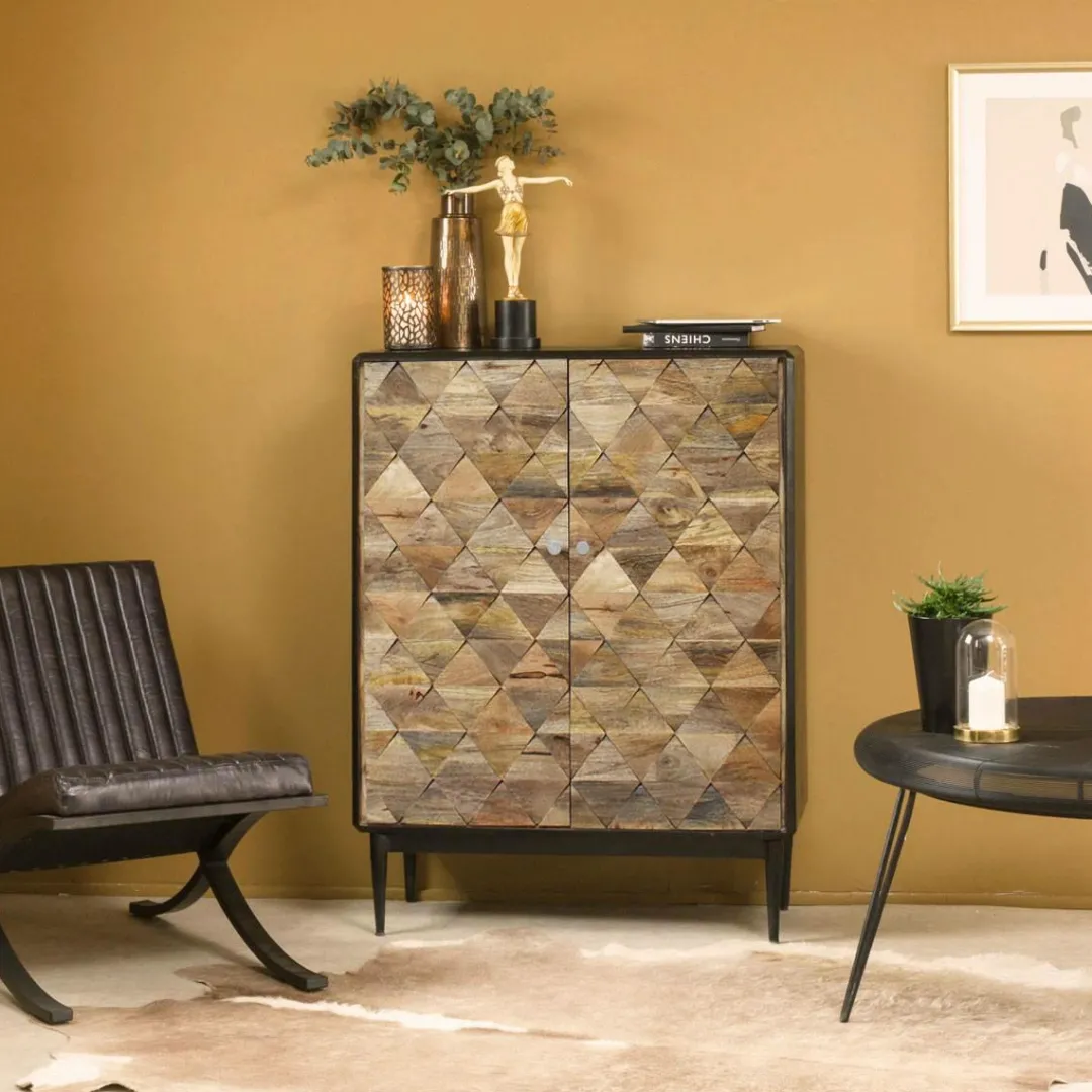 Conçu en manguier et métal noir, ce nouvel objet déco amènera une touche de luminosité à votre intérieur grâce aux nuances lumineuses en bois qu’on retrouve sur les losanges. Ce meuble met l’accent sur le rangement en vous proposant des espaces de stockage définis. Derrière ses 2 portes, vous trouverez d’une étagère fixe pour ranger votre vaisselle ou vos documents. Vous pourrez également habiller le plateau avec de la déco et des plantes…