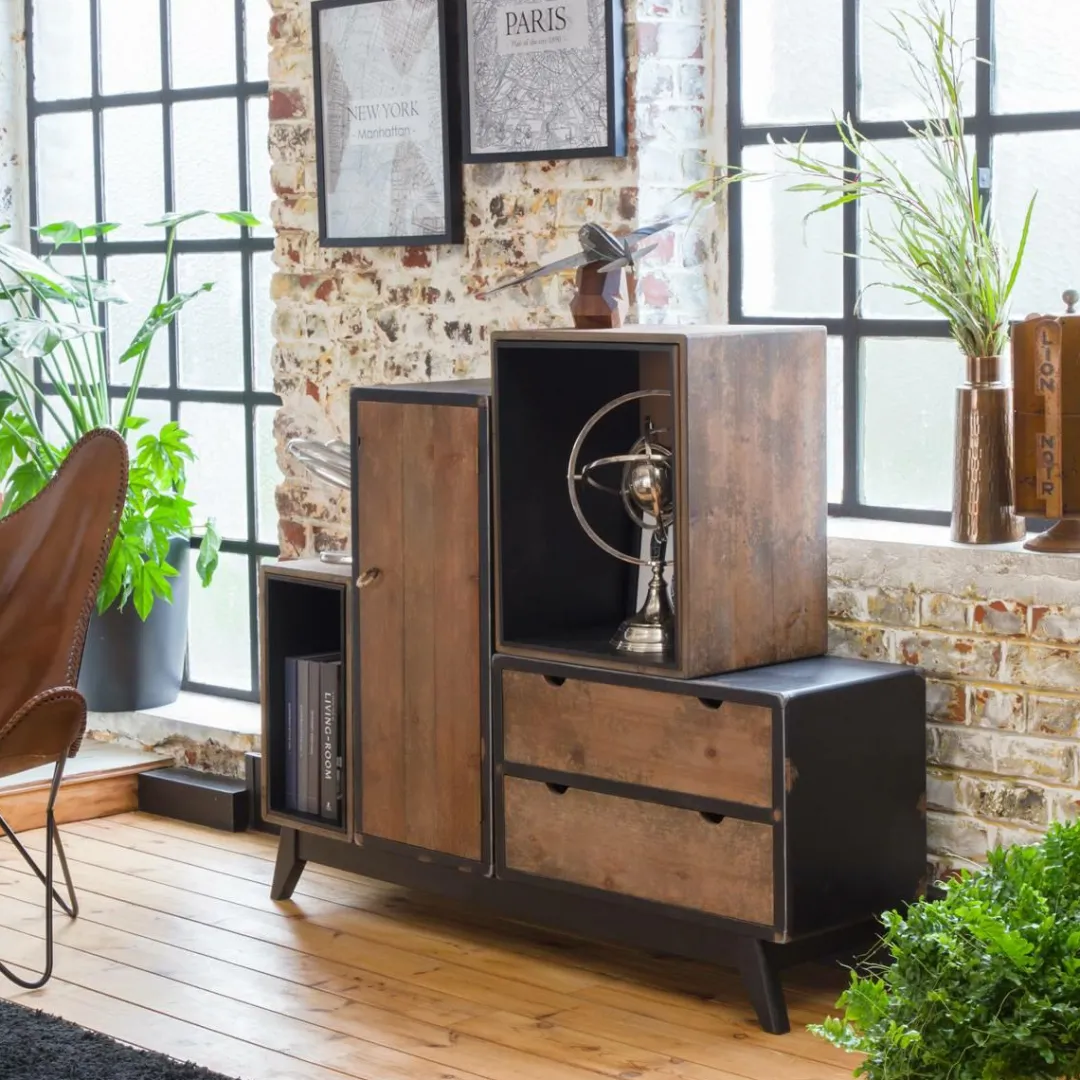 Composé de 4 compartiments au design propre à chacun d’eux, ce buffet vous offrira de nombreuses solutions de rangement ! Fonctionnel et moderne, il vous permettra de stocker grâce à ses casiers comprenant une porte et deux tiroirs mais aussi de décorer grâce à ses niches ouvertes ! Semblable à un buffet industriel, vous allez l’adorer !