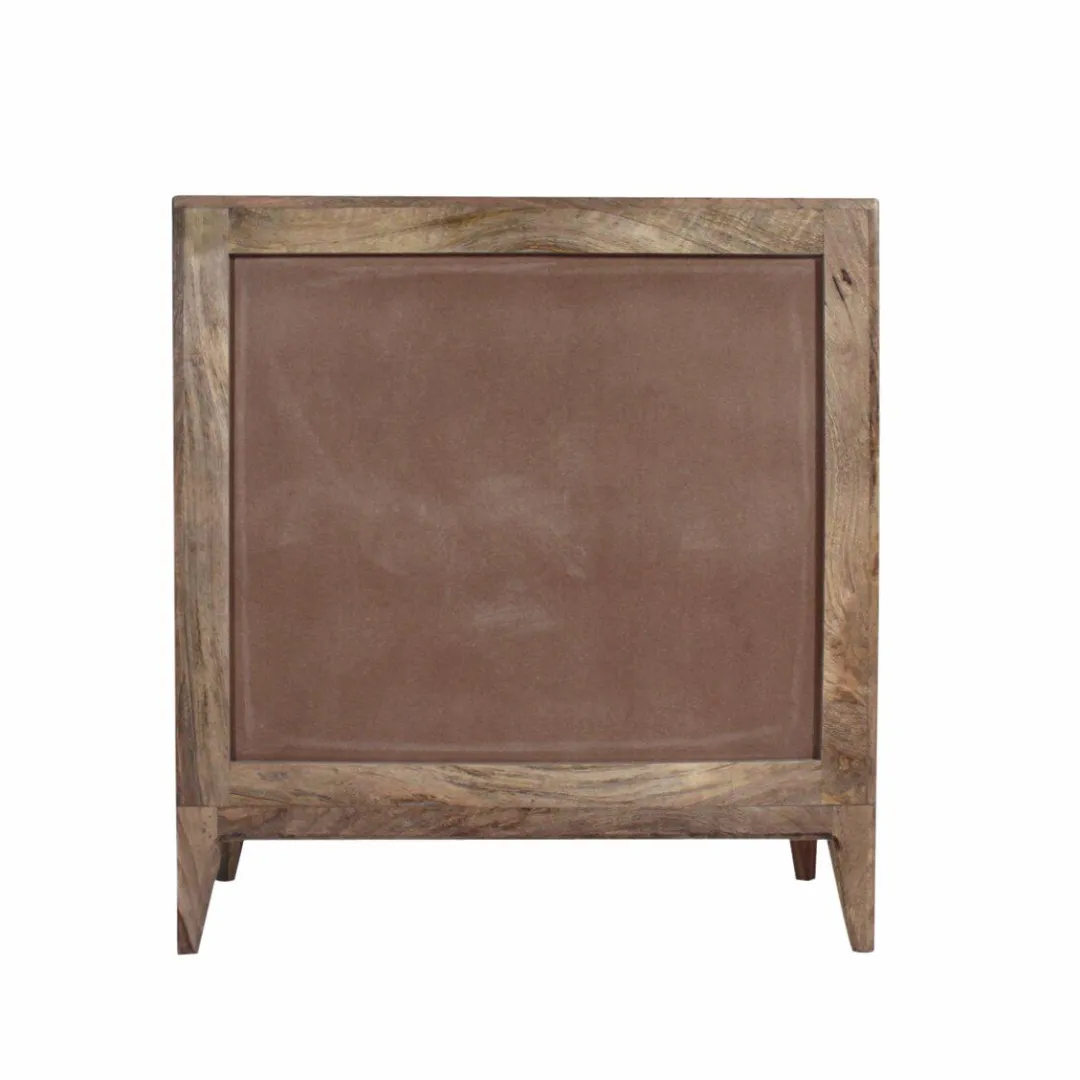Il est conçu à partir d’un matériau chaud qu’on aime beaucoup ; à savoir le manguier. Sa particularité ici est sa teinte. Il a été travaillé de façon à foncer ses nuances pour se rapprocher d’un bois tel que le merisier ou le noyer. Ses poignées en métal gris sont très joliment mises en valeur grâce au contraste entres les deux matériaux.