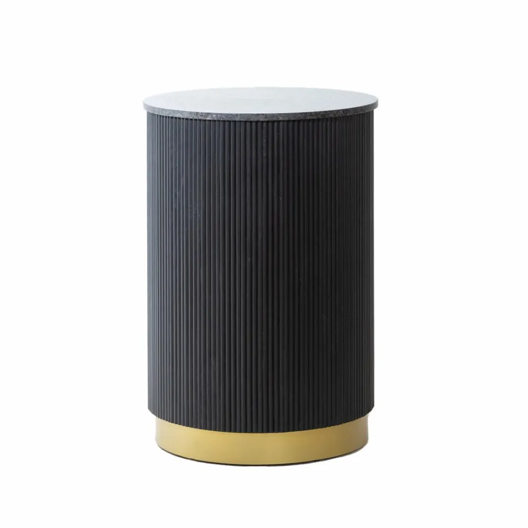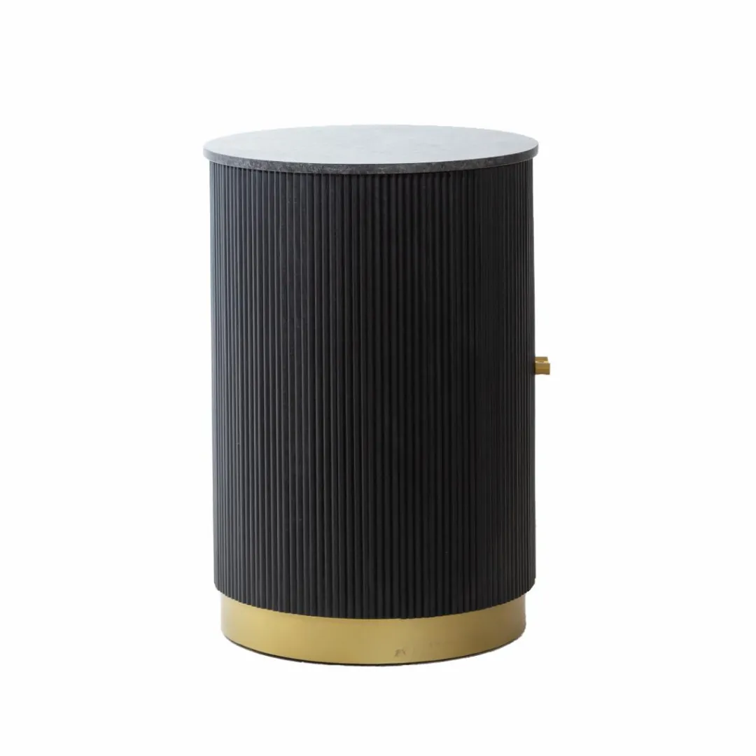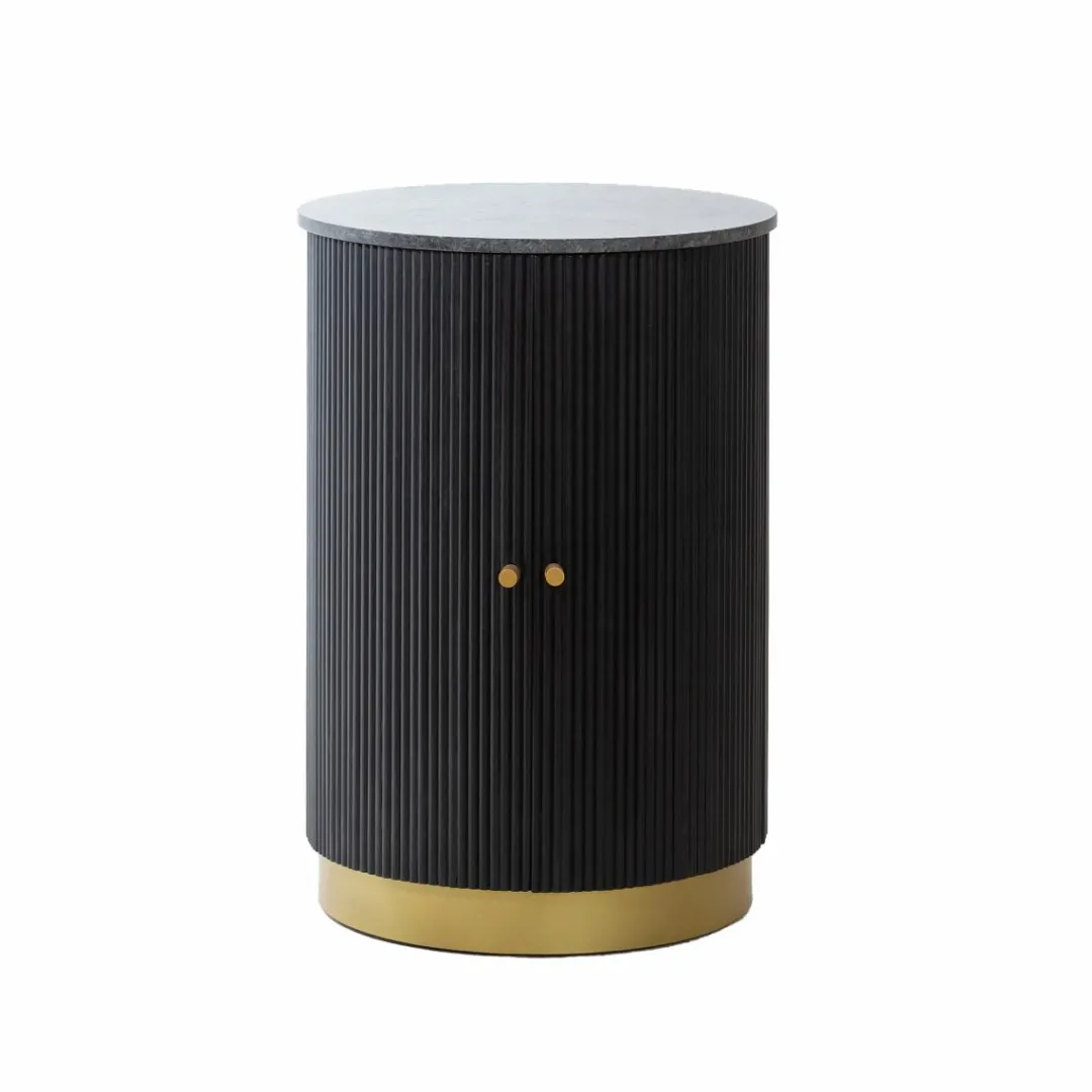 Le dessus est recouvert d’un luxueux marbre noir qui ajoute à la beauté et à la sophistication. Avec une hauteur de 81 cm et une largeur de 56 cm, il se distingue par ses dimensions – parfaites pour ranger tous vos objets sans compromettre l’espace au sol. Que vous cherchiez à exposer vos photos préférées ou simplement à ajouter du charme à une pièce de votre maison, le buffet rond Isaac répondra à vos attentes.