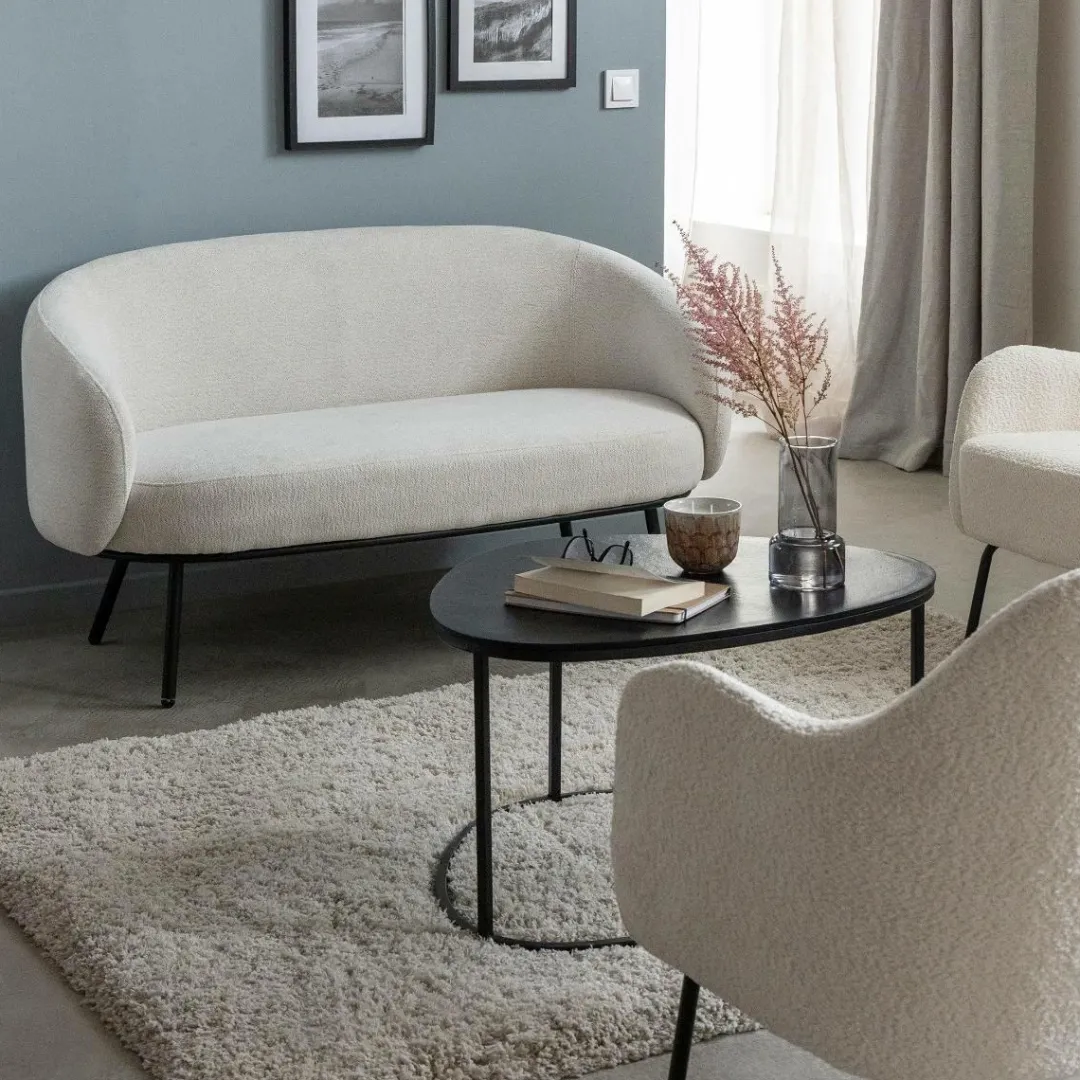 Ce canapé 2 places de la collection Filipa se distingue par son revêtement en tissu bouclette écru, doux et chaleureux, qui apporte une touche cocooning au salon. Son format compact de 135 cm en fait une assise idéale pour deux personnes.
