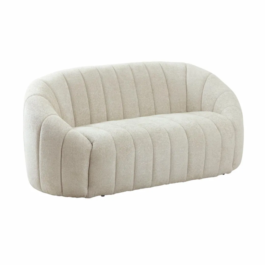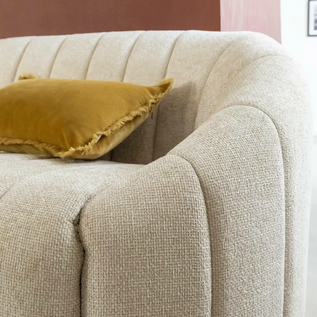 Ce canapé en tissu écru séduit par ses lignes douces et son design contemporain. Son revêtement au toucher agréable et sa teinte neutre apportent luminosité et élégance à votre intérieur. Avec sa forme arrondie et ses coutures verticales, il combine confort et esthétique pour créer une ambiance chaleureuse et raffinée dans le salon.
