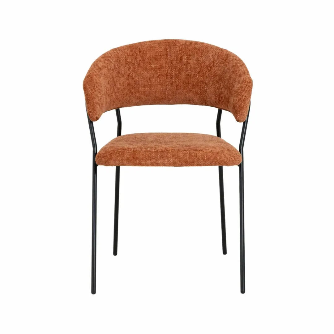 Cette chaise allie confort et modernité avec un design élégant et des finitions soignées. Son revêtement en tissu terracotta apporte une touche chaleureuse et tendance, parfaite pour dynamiser votre intérieur. Son dossier courbé et son assise moelleuse offrent un excellent confort, tandis que ses pieds fins en métal noir assurent stabilité et légèreté visuelle.