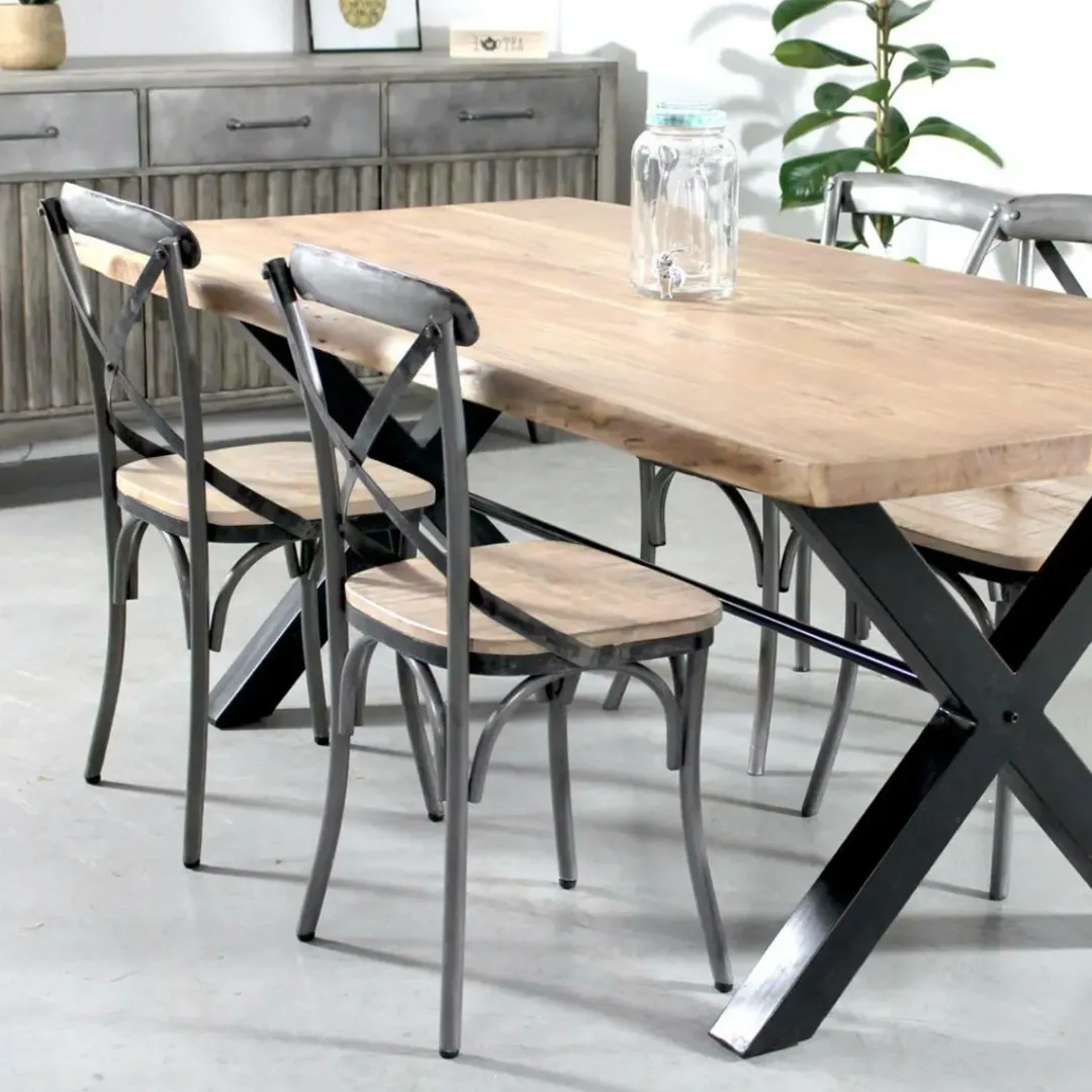 Vous êtes à la recherche d’un lot de 2 chaises originales et dans un style industriel ? Cette chaise en métal gris et en bois vieilli (bois de manguier) va vous inspirer ! Vous allez adorer l’aspect brut de sa structure qui crée l’impression d’un meuble usé par le temps. Son dossier croisillons lui donne un côté rétro / vintage sympathique et peu commun. Vous pourrez placer cette chaise industrielle vendue par 2 autour d’une table ou d’un bureau de préférence dans une matière brute comme le métal ou le bois.