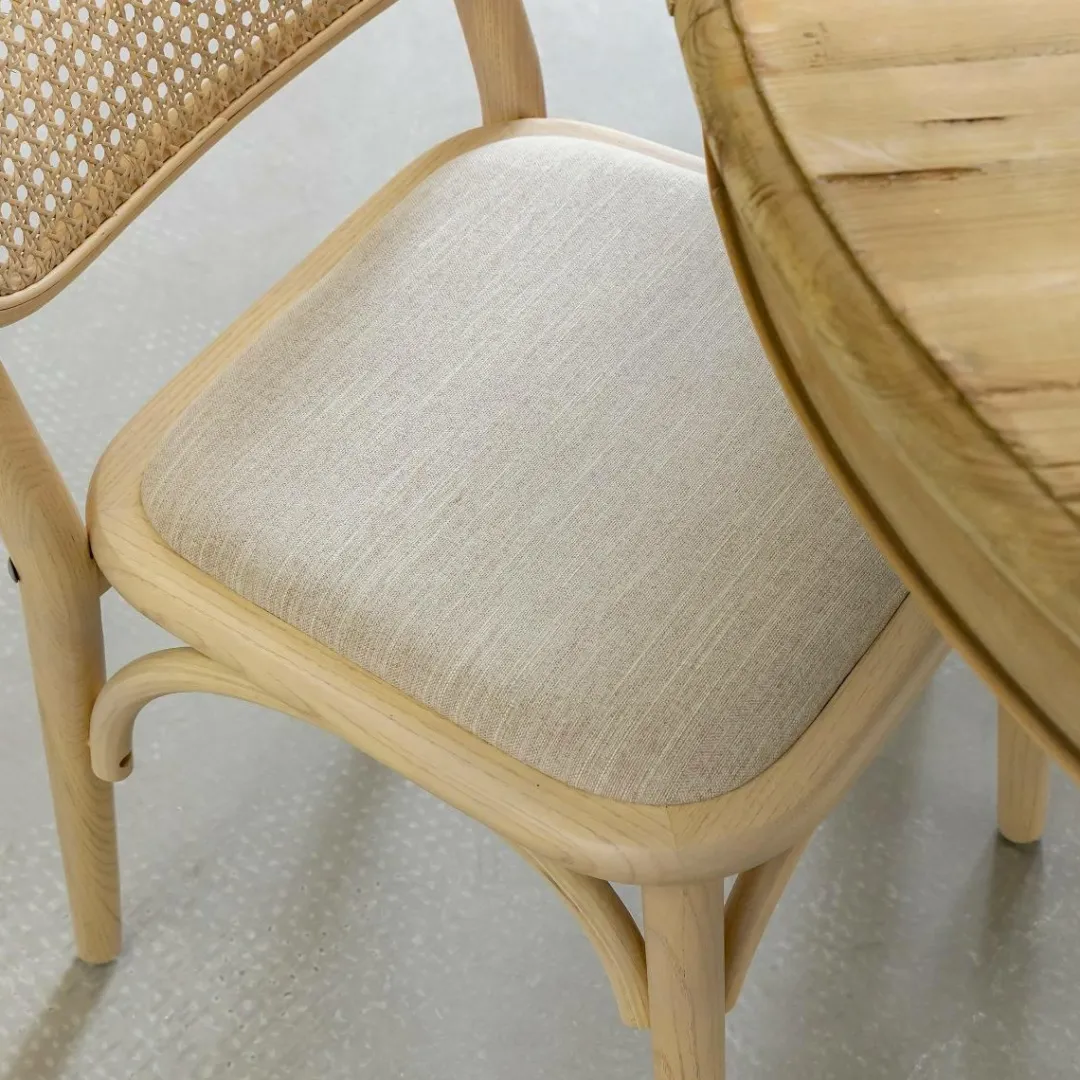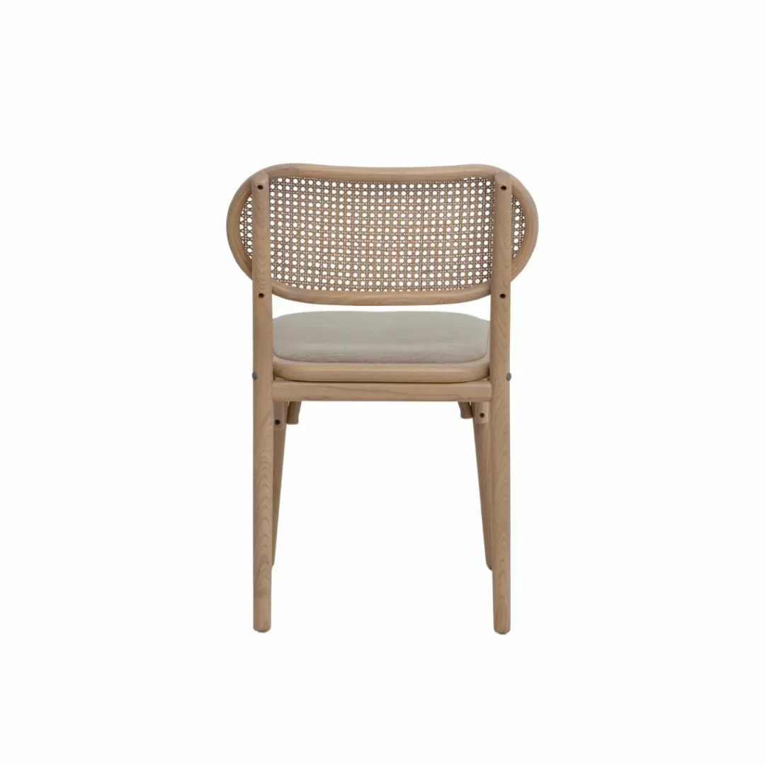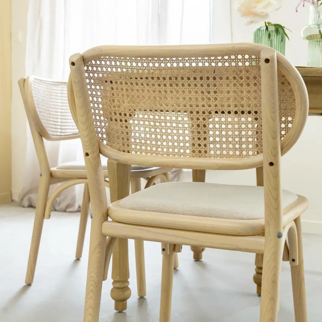 Le bois d’orme, reconnu pour sa robustesse et son grain subtil, confère à cette chaise un charme authentique et durable. Le dossier ovale en cannage naturel apporte une touche artisanale, tout en légèreté, tout en assurant un bon maintien du dos. L’assise est habillée d’un coussin en tissu beige chiné, à la fois doux et confortable, idéal pour une utilisation prolongée.
