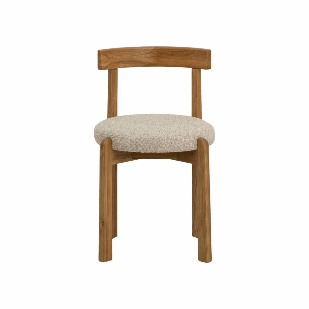 La structure en chêne massif met en valeur le veinage du bois et confère une solidité à toute épreuve. L’assise circulaire, généreusement rembourrée et recouverte d’un tissu bouclette clair, crée un contraste élégant avec les lignes anguleuses du piètement. Son dossier en demi-lune en bois massif apporte un excellent maintien et une vraie originalité visuelle.