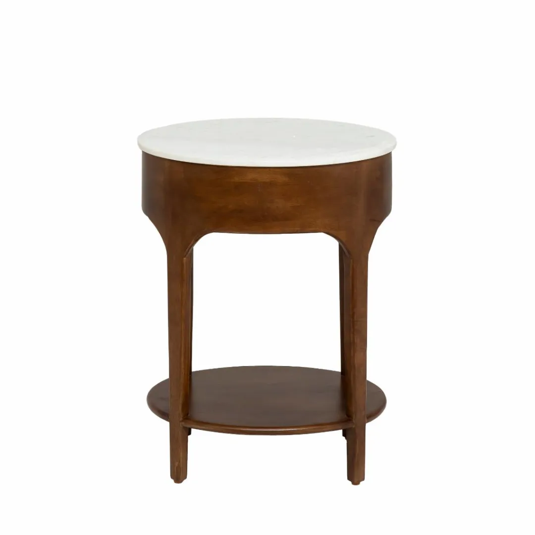Son plateau en marbre blanc apporte une note de luxe et de sophistication, créant ainsi un contraste saisissant avec le bois foncé. La poignée dorée ajoute une touche d’élégance supplémentaire à l’ensemble.