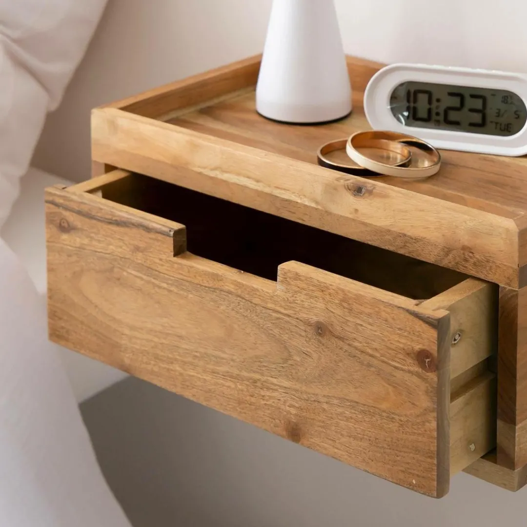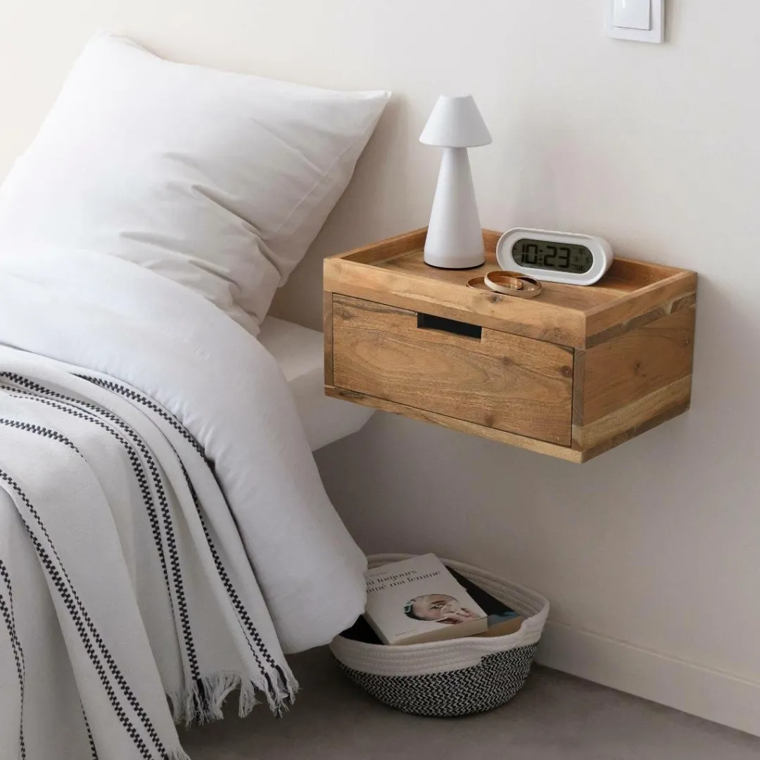 Chaque pièce est unique grâce aux veinures naturelles du bois d’acacia, qui confèrent à ce meuble un caractère authentique. Cette table de chevet suspendue est pensée pour allier style et fonctionnalité : un tiroir intégré permet de ranger discrètement vos petits objets essentiels, tandis que le rebord du plateau sécurise vos effets personnels, même en hauteur.