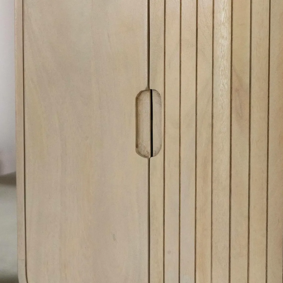 Fabriqué en bois de manguier, une essence naturelle et durable, ce meuble allie authenticité et modernité. Son bois clair et ses lignes verticales rainurées lui donnent un look scandinave et apaisant, parfait dans une salle de bain ou une entrée.