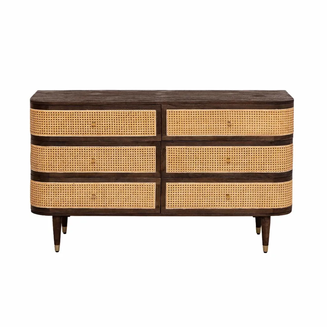 Ses poignées dorées et la touche dorée sur le bout des pieds en bois ajoutent une subtile note de sophistication. La façade des tiroirs en cannage apporte une texture unique et un charme intemporel à l’ensemble.
