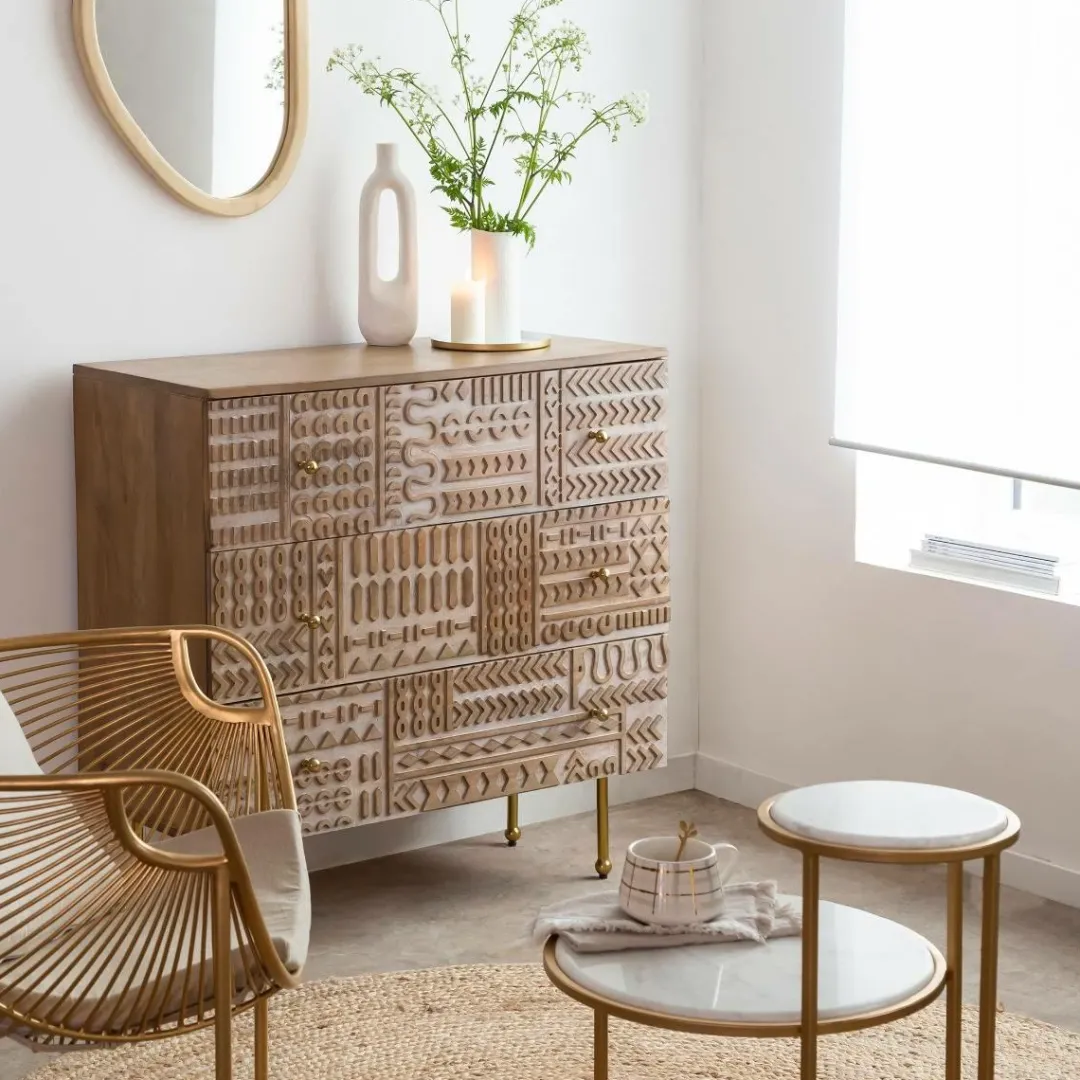 Si vous êtes à la recherche d’un meuble intemporel pour embellir votre intérieur, ne cherchez plus : la commode Léopold est là ! Méticuleusement sculptée dans du bois de manguier, cette élégante commode est posée sur 4 beaux pieds en métal doré, ajoutant une touche accrocheuse à votre décor. Sa porte est ornée d’un motif sculpté pour plus de détails, alliant élégance et minimalisme.