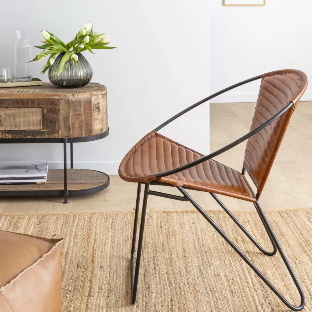 Fabriqué en cuir de haute qualité, ce fauteuil a un aspect et un toucher luxueux, parfaits pour créer une atmosphère chaleureuse dans n’importe quelle maison. Sa fine structure en métal noir lui confère une élégance aérienne inégalable, tandis que son style arrondi lui confère un attrait visuel.