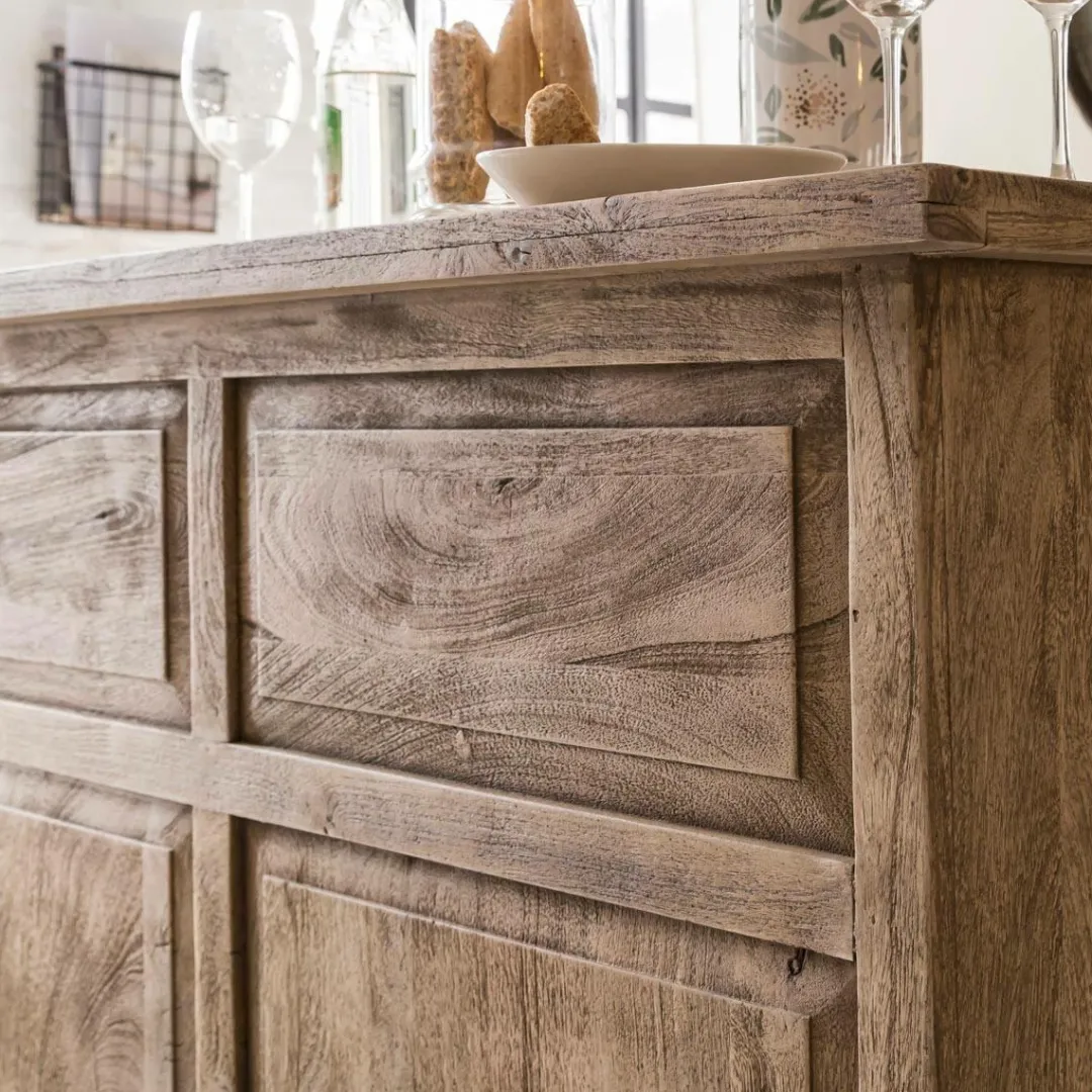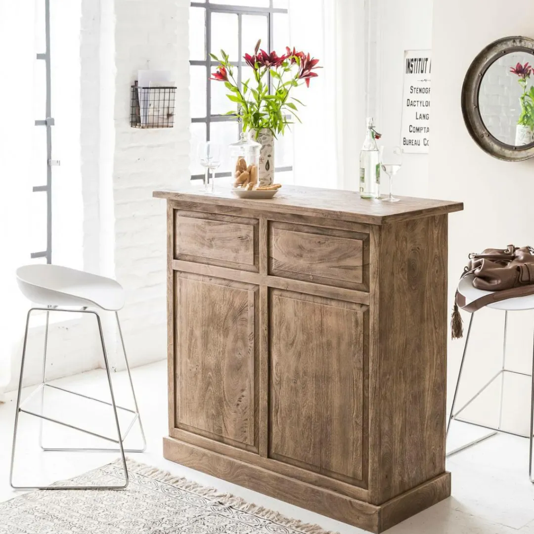 Les dimensions optimales de ce bar vous permettront d’en faire rapidement une pièce maitresse. Conçu à partir d’un matériau chaud, à savoir le manguier brossé, on aime les nuances lumineuses et positives. En alliant subtilement le bois et le métal gris foncé, ce meuble se donne les moyens d’intégrer différents types de décoration. Le dos de ce meuble est en MDF.