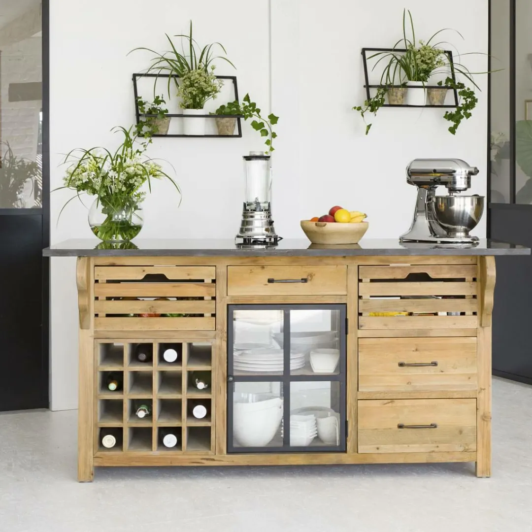 Cet îlot central bois massif comportant un range bouteille est très moderne et fonctionnel. Aux allures industrielles, il dispose de nombreux rangements qui faciliteront votre quotidien. Vous allez tout autant apprécier sa grande praticité que son charme intemporel.