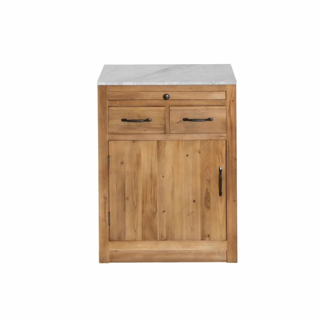 Ce meuble de cuisine séduit par son authenticité et son charme indéniable. Le mariage subtil du bois recyclé, du métal et du marbre lui confère un style à la fois moderne et empreint de caractère. Avec ses teintes claires de vieux pin, il s’intègre facilement dans tous les types d’intérieurs, apportant chaleur et convivialité à votre pièce. Créez un espace où il fait bon cuisiner et partager en famille !