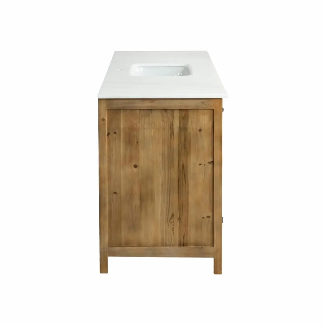 Ce meuble de cuisine en pin recyclé avec plateau en marbre blanc conjugue esthétique rustique et fonctionnalité contemporaine. Conçu comme un meuble bas de cuisine, il offre un espace de travail élégant grâce à son plan en véritable marbre, parfait pour préparer les repas tout en apportant du cachet à votre pièce.